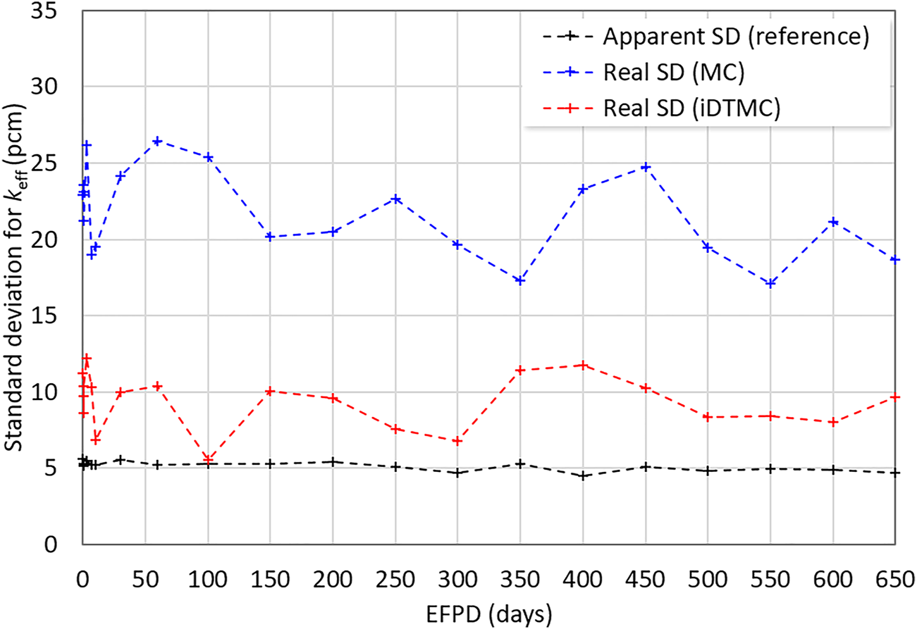 Figure 6 shows the standard deviations of the burnup dependent multiplication factor. The reference solution provides the apparent SDs, while the standard MC and iDTMC methods give the real SDs estimated by the batch calculation. The apparent SD for the reference solution is estimated to be around 5 pcm on average. According to the figure, the iDTMC method clearly shows smaller stochastic uncertainties throughout the simulation than the standard MC. The average of values at each time step is estimated to be 9.4 pcm in the iDTMC method and 21.6 pcm in the standard MC method.