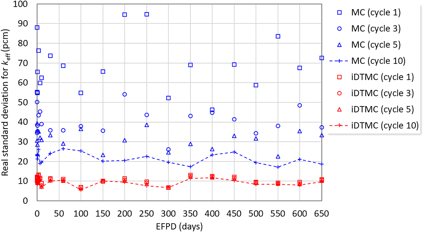 Meanwhile, the iDTMC method has shown the effectiveness of the early truncation of the MC solutions in many steady-state neutronic analyses (Kim, Kim, and Kim 2020; Kim and Kim 2022). It means that the iDTMC method can provide accurate and reliable solutions even within 3 active cycles. This characteristic also has been evaluated in this depletion calculation by assessing the statistical errors at the different active cycles. Figure 7 describes the real SDs of the criticality at the specific active cycle 1, 3, 5, and 10, respectively. The standard MC method shows higher SDs at the earlier active cycles. On the other hand, the iDTMC method has consistently smaller SDs even from the early active cycles and seems not significantly affected by the number of active cycles. This implies that the computational burden for the active cycles can be possibly reduced by decreasing the number of cycles.