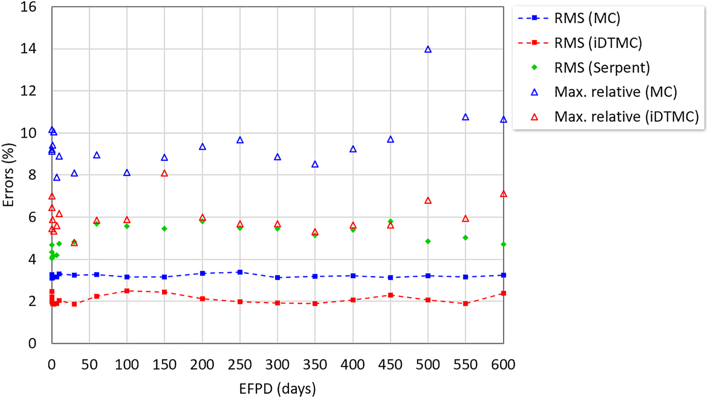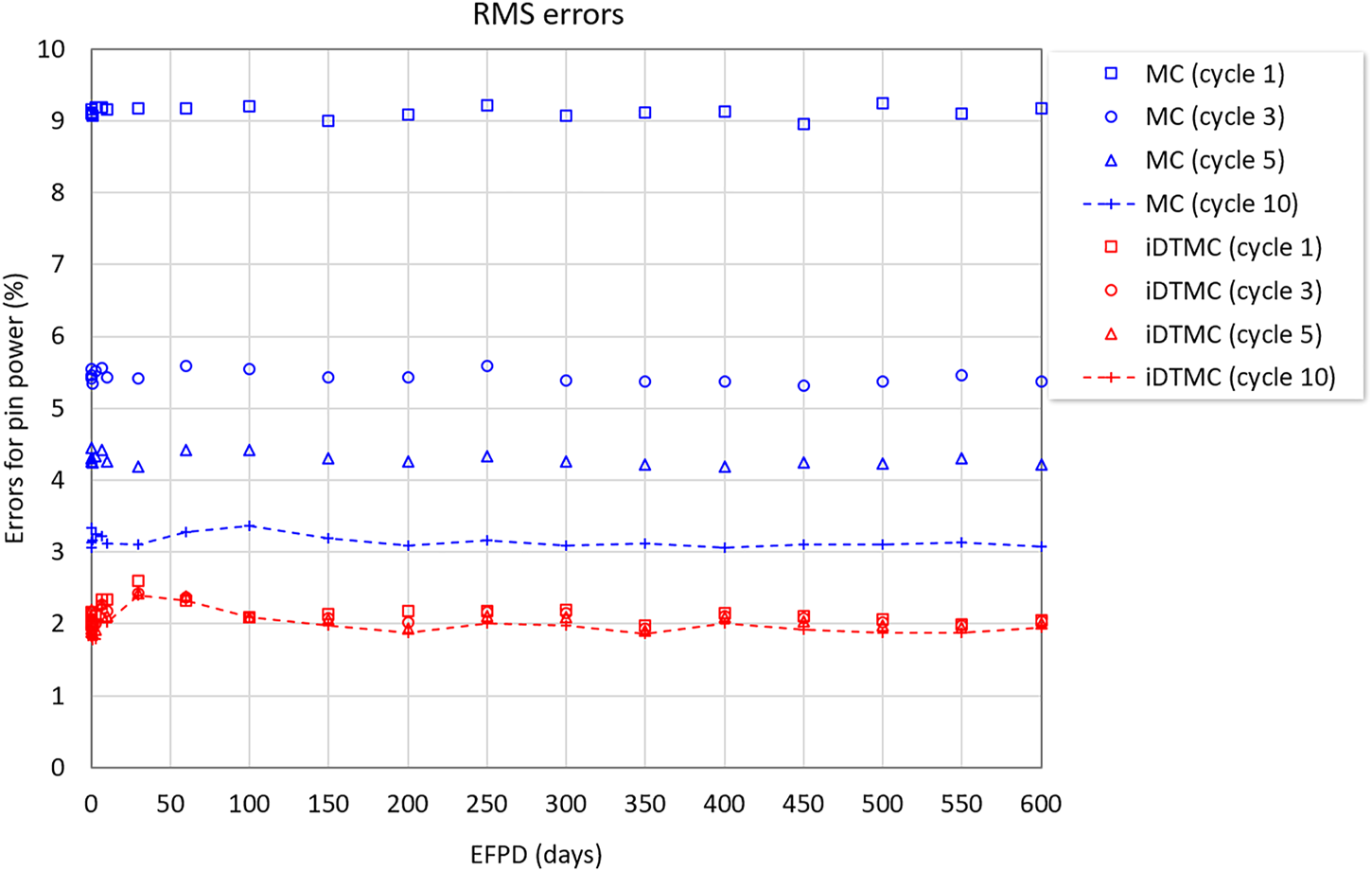 The effectiveness of the early truncation of the MC solutions also has been assessed with the pin power profile. The RMS errors were estimated at the different active cycles (i.e. 1, 3, 5, and 10 cycles) in Figure 11. The RMS errors of the standard MC were more than 9% at the first active cycle and gradually decreased with the cycle accumulation. On the other hand, the RMS errors of the iDTMC method were already low from the first active cycle and slowly decreases with the active cycles. The iDTMC RMS errors of the pin-power profile are consistently lower than in the standard MC case in all active cycles and the difference gets smaller with active cycles.