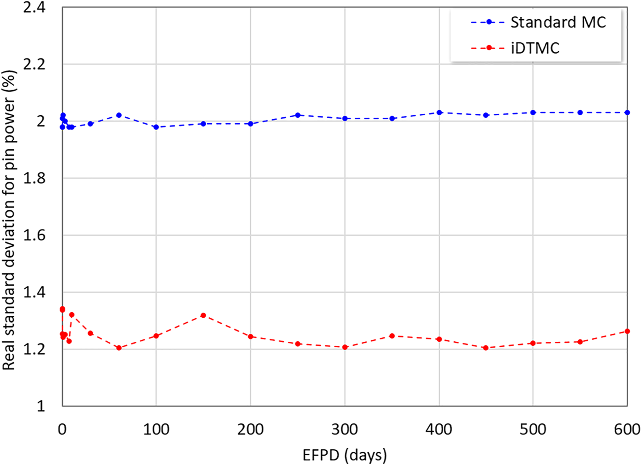 Figure 9 shows the average of real standard deviations of the 2-D pin power distribution at each burnup step. The real standard deviation for the pin power was also calculated with 15 independent runs. The iDTMC method shows smaller stochastic uncertainties for the pin power distribution. The iDTMC method reduces the real standard deviation by 40% compared to the standard MC method with the same calculation condition. Figure 10 shows the RMS errors for the 2-D intra-pin power distribution. The ring-wise intra-pin power distribution was normalized for the average to be unity. The iDTMC method has similar RMS errors with the standard MC method, indicating that the intra-pin power profile was properly determined by the intra-pin renormalization scheme.