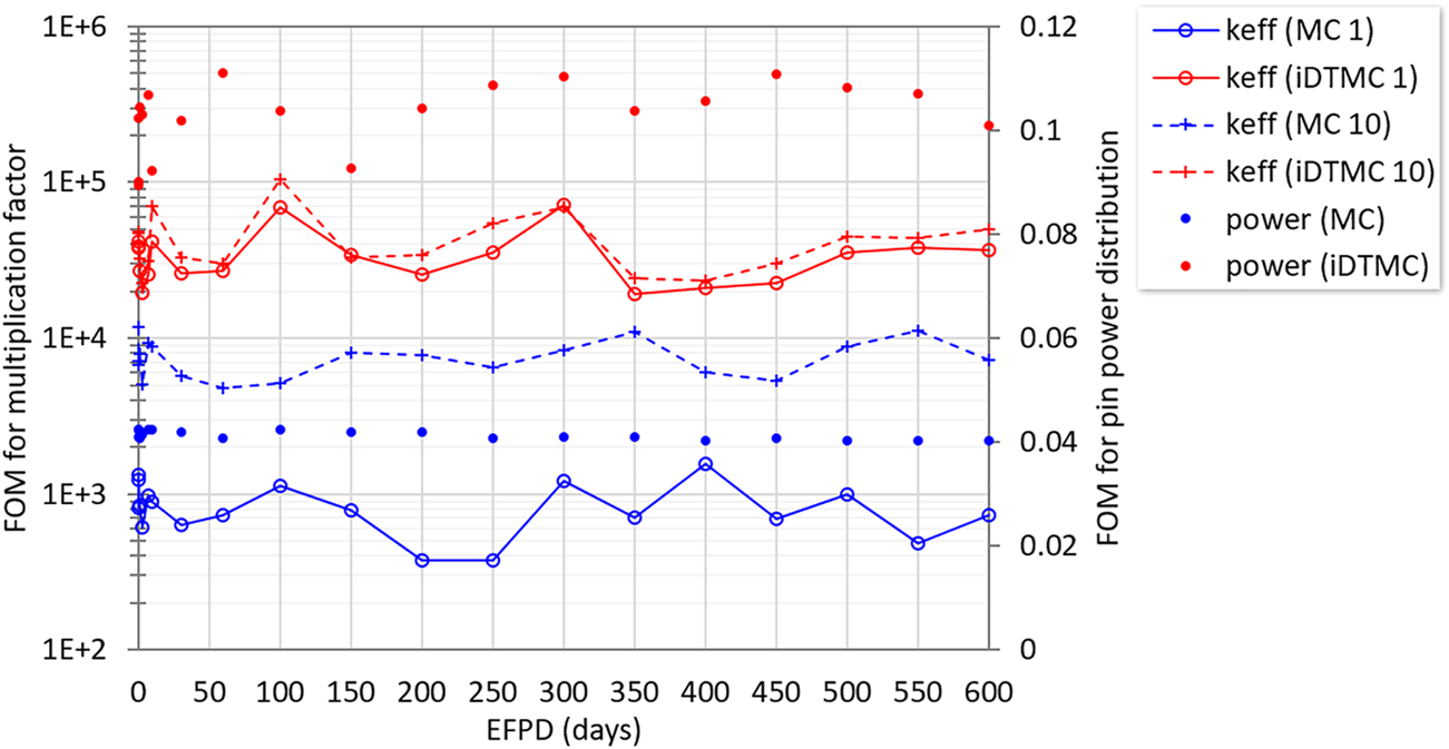 The FOM of the multiplication factor is also calculated at the first active cycle to demonstrate the effectiveness of the early truncation in the iDTMC method. The iDTMC shows even higher FOM from the beginning of the active cycle. The FOM of the iDTMC method at the first active cycle is shown to be comparable to that at the active cycle 10. On the other hand, the FOM of the standard MC at the first active cycle is clearly lower than that of the 10th active cycle. The average FOM of the standard MC for the multiplication factor is 8.6E+2 at the first cycle and 3.5E+4 at the last cycle, while it is 7.6E+3 at the 1st cycle and 4.3E+4 at the 10th cycle for the iDTMC method, respectively. The iDTMC FOM is ∼40 times higher at the 1st active cycle and ∼6 times higher at the 10th cycle than that of the standard MC.