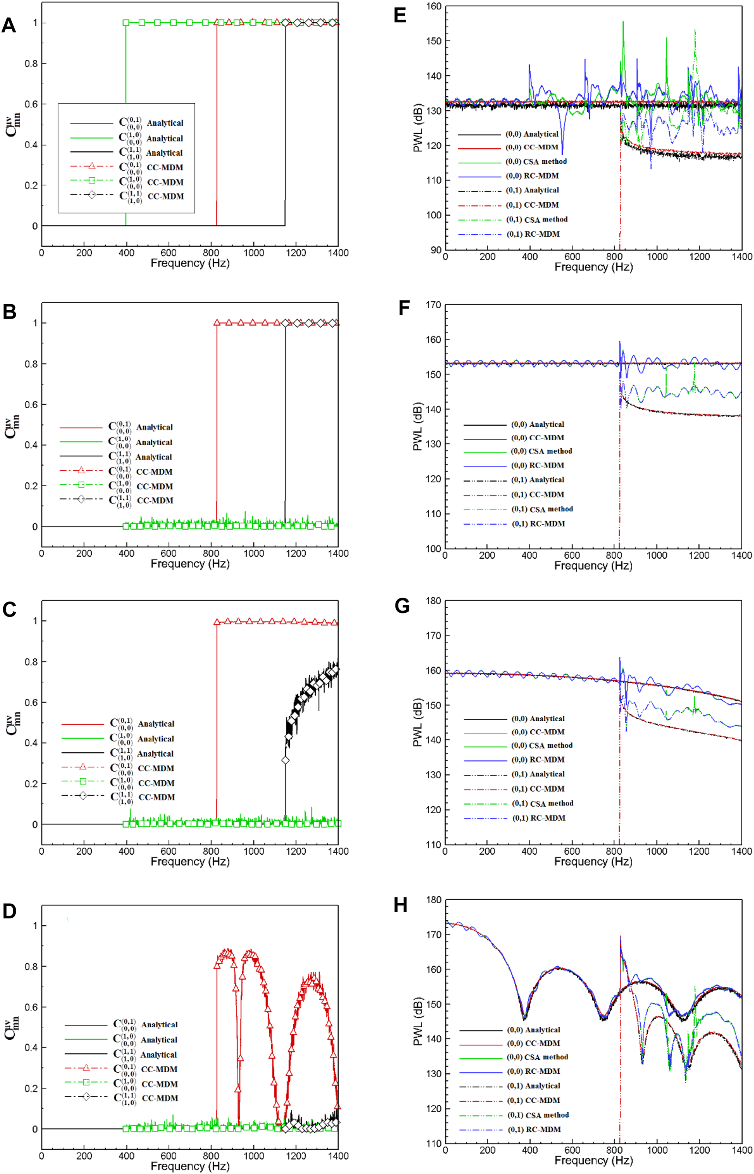 Modal coherence and sound power results of CC-MDM, CSA method, and RC-MDM appended with analytical prediction. Broadband sound fields were synthesized by using different ring numbers of incoherent monopole sources shown in Table 2. Diagrams (A–D) depict the mode coherence; diagrams (E–H) show the modal sound power.