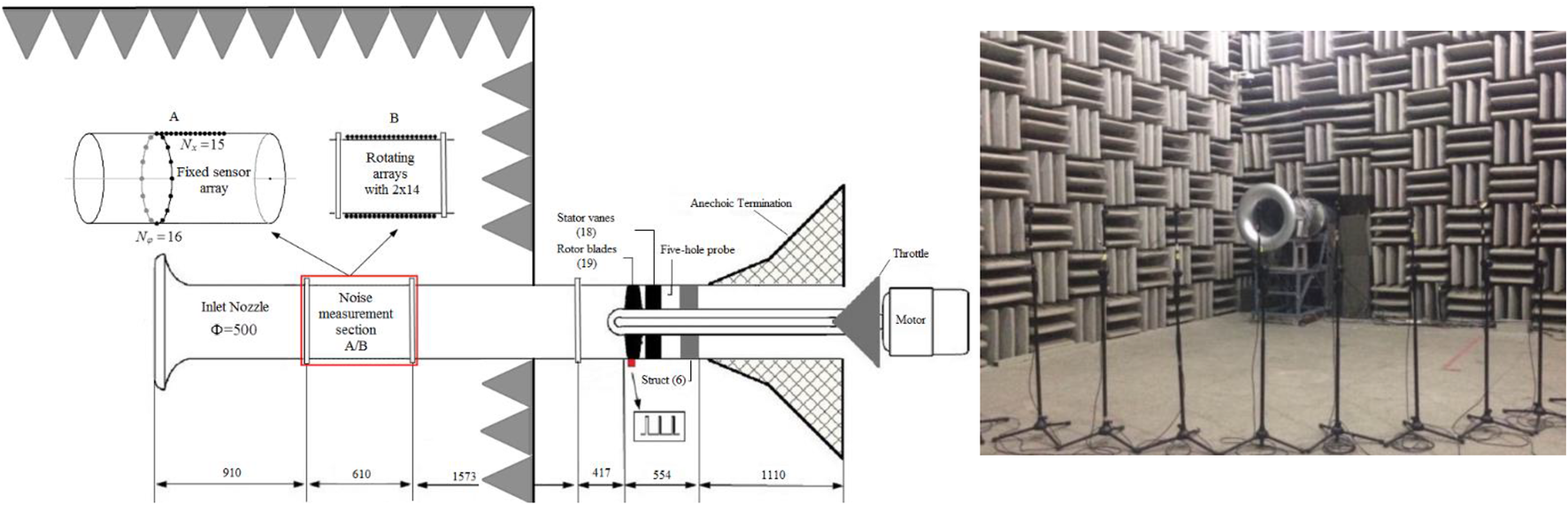 One important aspect of this paper is to experimentally investigate the modal coherence distribution with respect to an axial fan test rig. A schematic of the experimental set-up is shown in Figure 4. It was designed with the intention to capture the most relevant acoustic features of an axial fan. On the inlet side there is a short duct section with a bell mouth nozzle and there are no flow straighteners or screens in the inlet duct. The single-stage axial fan consisting of 19 rotor blades and 18 stator vanes was driven at 3,000 rpm with the help of one motor providing 18.5 kW electric power. The diameter is 0.5 m, and the axial Mach number is 0.1. The outlet duct is equipped with an anechoic termination device; this condition strictly conforms to the international standard ISO 5136 for in-duct sound power determination. The number of stator vanes was designed such that the rotor–stator interaction tone at the blade passing frequency (BPF) is acoustically cut on.