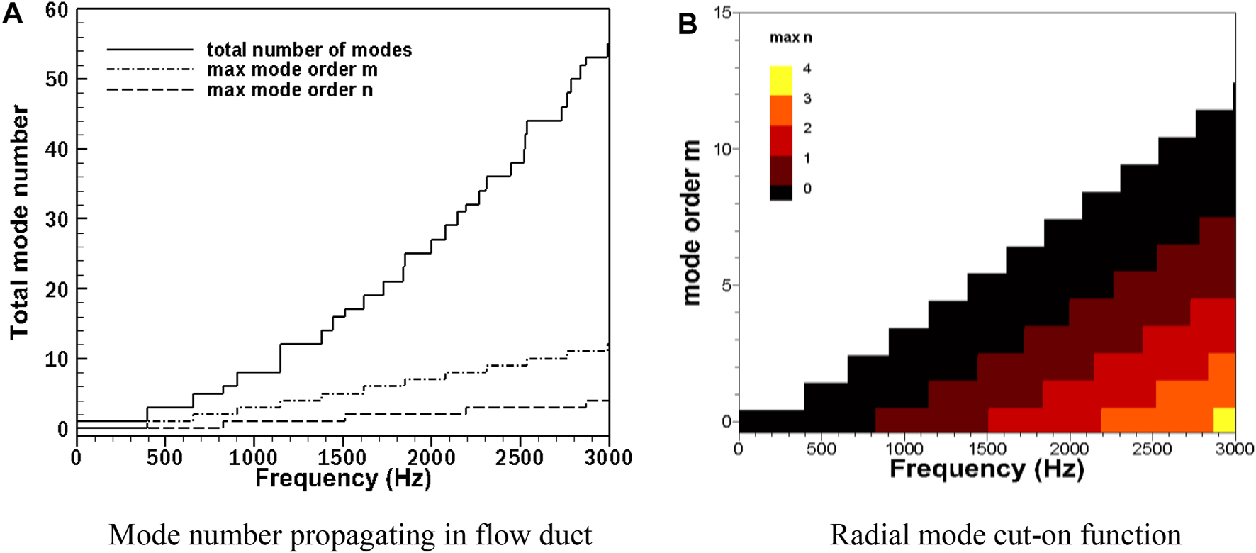 Modal cut-on function of a single-stage axial fan: (A) shows the mode number propagating in the flow duct; (B) shows the radial mode cut-on function.