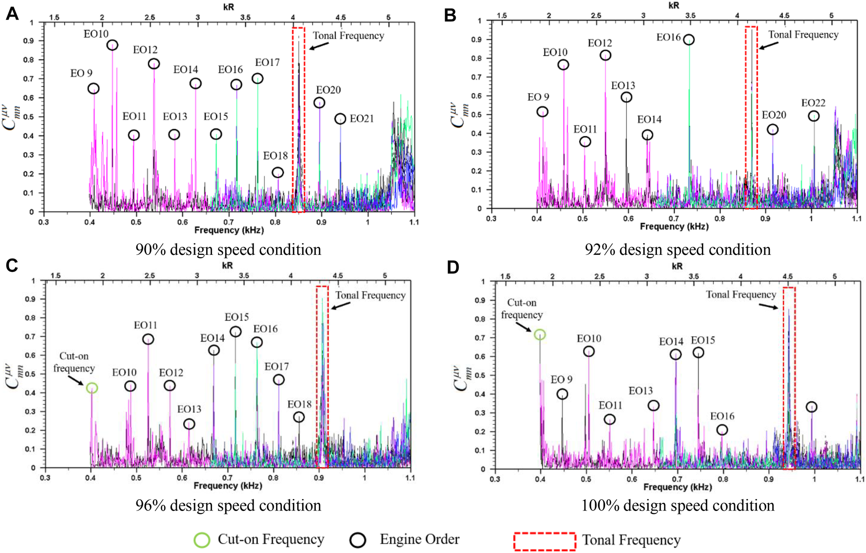 In addition to the peaks appearing at the tonal noise frequencies, multiple peaks at other frequencies also exist in the experimentally measured coherence coefficient results. The main reasons can be attributed to two categories: (a) when the frequency is close to the mode cut-on frequencies, due to the extreme eigenvalue generated in the process of matrix operation, the instability of numerical calculation leads to unreal complex modal amplitude. The modal coherence coefficients become exaggerated accordingly, which is represented by a green circle in Figure 6; (b) there are many peaks at the shaft frequency and its harmonics. For example, in Figure 6C, the fundamental shaft frequency (engine order [EO]) is 47.6 Hz; the modal coherence coefficients existing peak at 666, 714, 761.5, and 809 Hz. These frequencies correspond to EO14, EO15, EO16, and EO17, which are marked with black circles in Figure 6. The amplitudes of these coherence coefficient peaks are relatively small to that of tonal noise, and the occurrence frequencies are determined regularly. It can be considered to be the mechanical noise generated by the rotating shaft. Therefore, they have limited influence on the acoustic modal coherence characteristics of the flow duct.