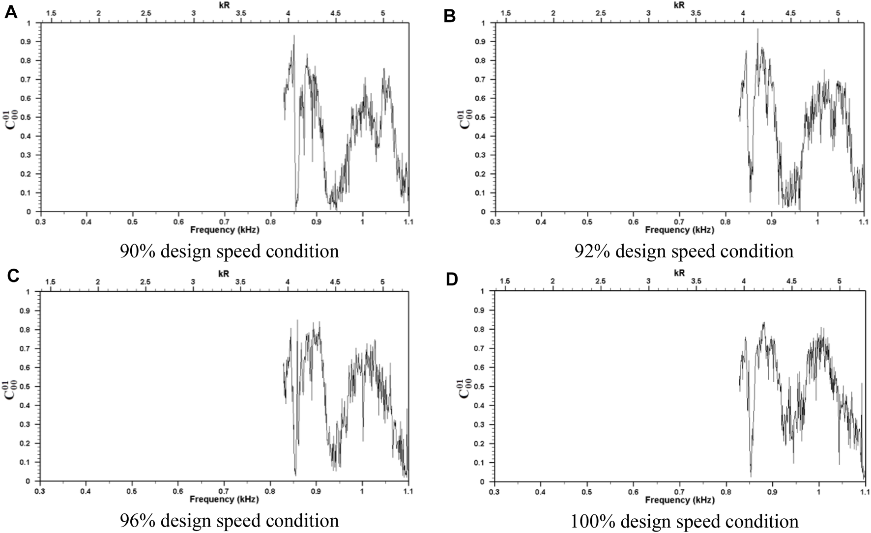Modal coherence coefficient between mode (0, 0) and mode (0, 1): (A–D) show the modal coherence coefficient between mode (0, 0) and mode (0, 1) under 90%, 92%, 96% and 100% design speed condition separately. represents the modal coherence coefficient between and modes.