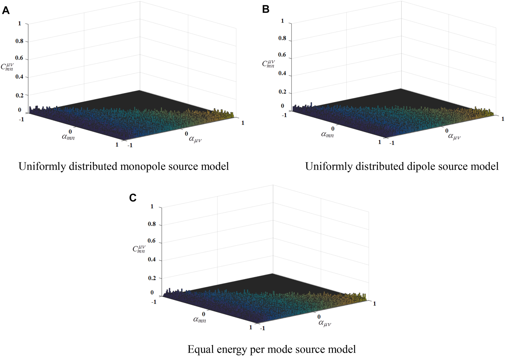 Modal coherence results of three sound source distribution models: (A) shows the results of uniformly distributed monopole source model; (B) shows the results of uniformly distributed dipole source model; (C) shows the results of equal energy per mode source model. represents the modal coherence coefficient between and modes.