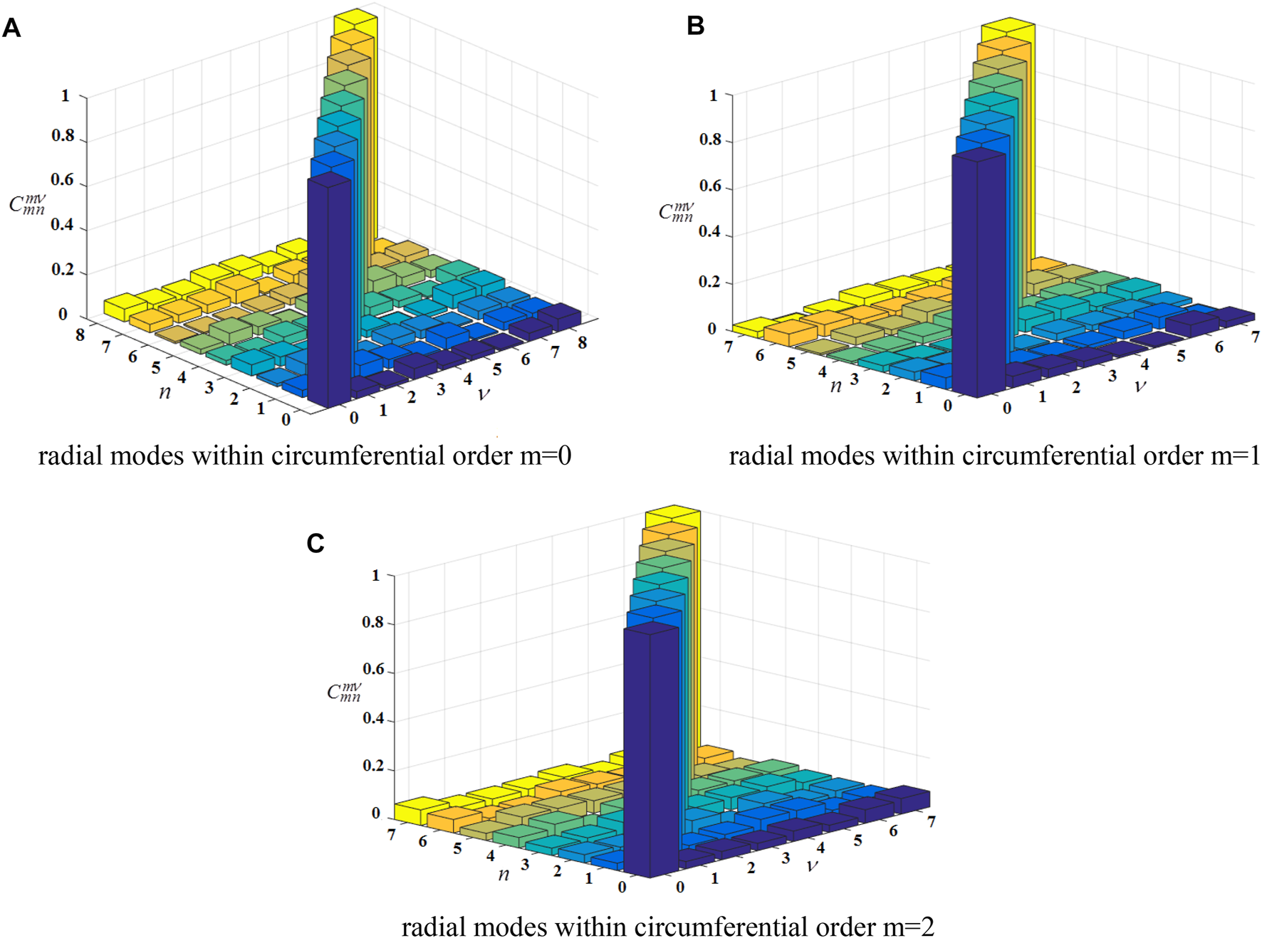 Modal coherence results between radial modes with same circumferential order: (A–C) show the radial modes within circumferential order m=0, m=1, m=2 separately. represents the modal coherence coefficient between and modes.