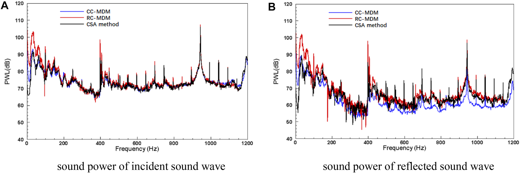 Comparison of sound power results calculated by different mode decomposition methods: (A) shows the sound power of incident sound wave; (B) shows the sound power of reflected sound wave. Blue line, red line and black line represents the results applying CC-MDM, RC-MDM and CSA method separately.