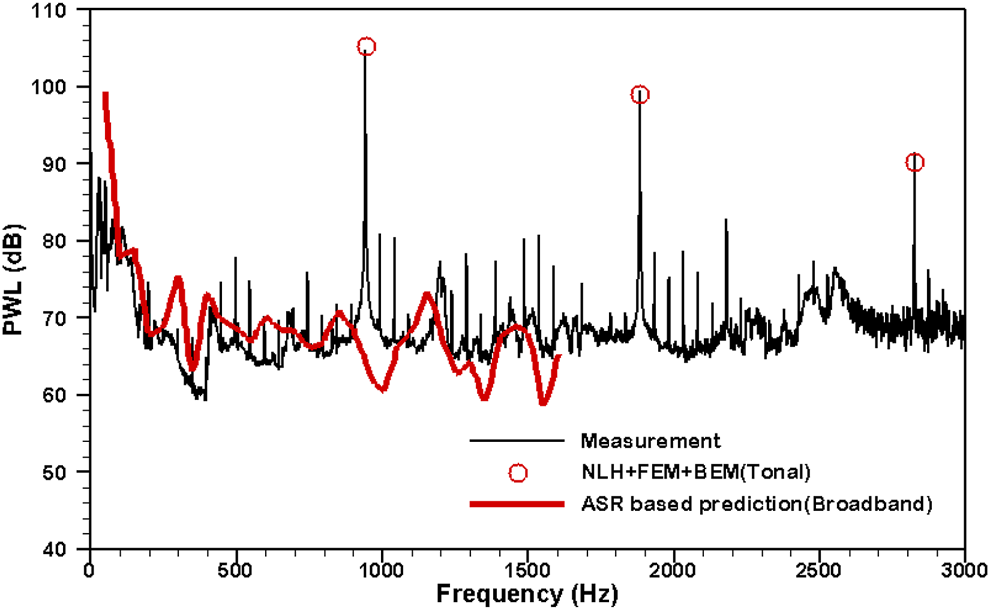 Under the framework of Sino-European cooperation, the NUMECA is the name of an internationally renowned computational fluid dynamics business company, conducted a numerical acoustic simulation on the single-stage axial fan duct device used in this research. As shown in Figure 11, the broadband mode decomposition result calculated by the RC-MDM with rotating sensor arrays is marked as a black solid line; the thick red line is the predicted broadband noise result calculated by NUMECA, using the adaptive spectral reconstruction method. The red circle symbol indicates the predicted tonal noise result. The results of the broadband noise spectrum are in good agreement in the frequency range (50–1,600 Hz), and the overall magnitude is around 68 dB. The broadband noise spectral characteristics are also very consistent at a special frequency, for example, the leap in sound power spectra at 400 Hz. In the tonal noise part, less than 1 dB deviation appears at 1BPF, and less than 0.5 dB arises at 2BPF. At 3BPF, the deviation increases to 1.5 dB. In general, fan noise measurements based on RC-MDM method using the rotating microphone array can be added to the aircraft turbomachinery noise database as standard data, which can provide evaluation and verification criteria for other broadband noise measurement methods or numerical simulation algorithms.