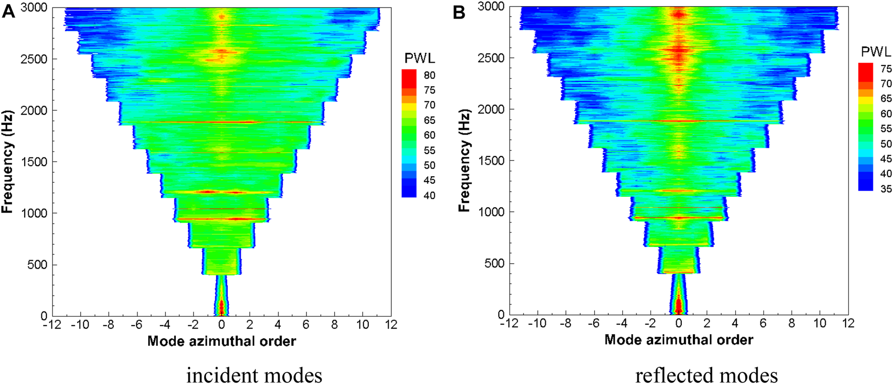 Broadband modal sound power distribution: (A) shows the modal sound power distribution map of incident modes; (B) shows the modal sound power distribution map of reflected modes.