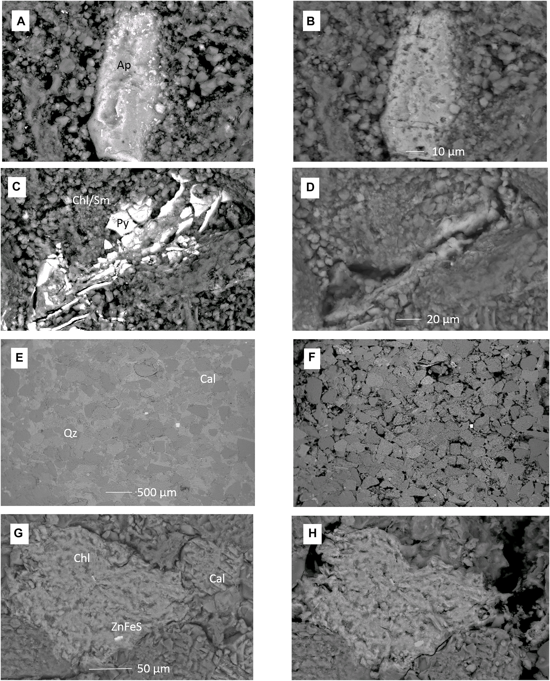 Three cores (ironstone 1022.40 m, feldspar-rich sandstone 1043.70 m, and calcite cemented sandstone 1056.03 m, Table 1) were prepared as thin sections on fused quartz slides for X-ray fluorescence microscopy (XFM) at the XFM beamline of the Australian synchrotron. Quartz slides were used since standard glass slides may contain a background of trace metals including As that can interfere with the analysis. A range of major, minor, and trace metals were detected at a spatial resolution of up to 2 µm, and at a dwell time of 10 msec/pixel including Fe, Ca, Mn, K, Ti, Ni, Cr, Pb, As, Sr, Zr, Zn, and Rb. Thin sections were attached using Mylar tape to a Perspex plate sample holder and mounted to the instrument translation stage. Scanning fluorescence microscopy was performed on the fly, using an X-ray beam (18.5 KeV) focused with Kirkpatrick–Baez mirrors to ∼ 2 µm and using the Maia detector to produce fluorescence maps. Foil standards were run daily to calibrate elemental concentrations, with the instrument described in detail previously (Ryan et al., 2010; Paterson et al., 2011; Ryan et al., 2014). False color images of concentration distributions and quantified concentrations over mineral areas were generated from the raw data using the software GeoPIXIE (CSIRO, 2011). Note that several light elements were not measured/imaged including Si, Al, Mg, and S. Subsequently, the same areas mapped were imaged by SEM-EDS to confirm the mineral phases hosting metals; this was especially important for clays and sulfides since Si, Al, and S were not imaged in XFM (Pearce et al., 2021a).
