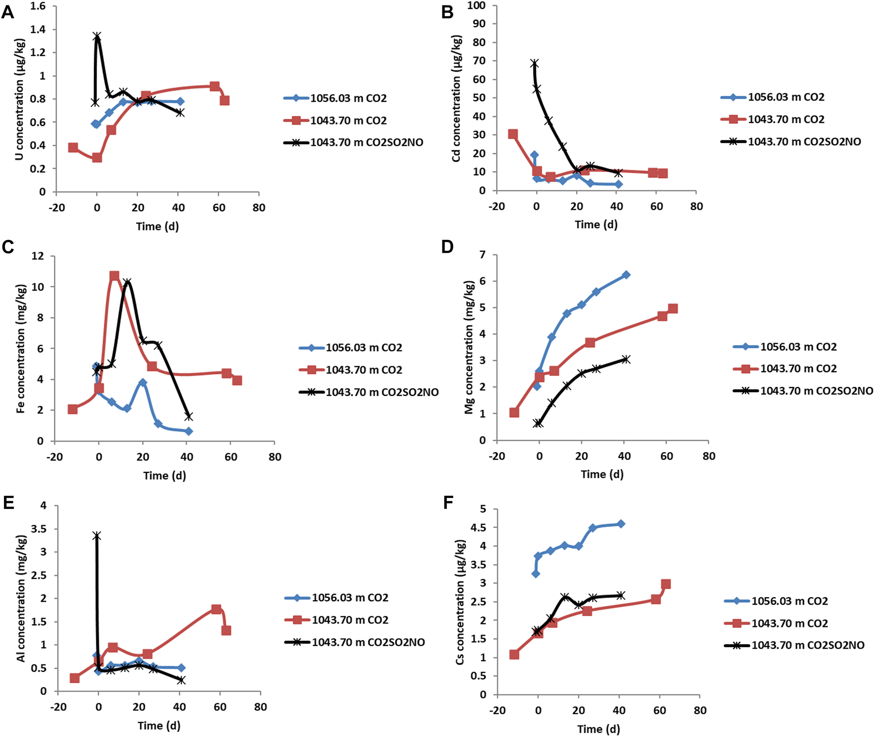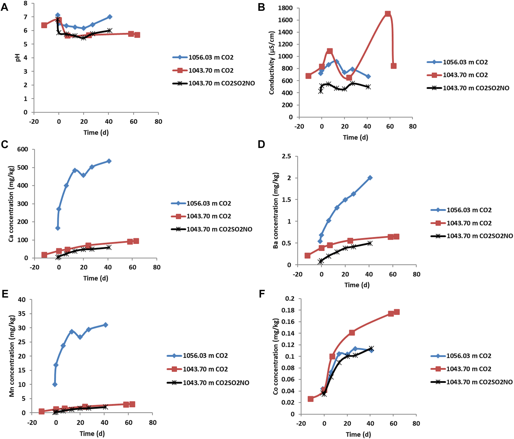 The potential for changes to aquifer water quality is a risk factor considered in environmental impact assessments of CO2 storage sites. However, studies of CO2-induced metal mobilization and fate in low-salinity storage complexes have generally been limited to shallow sites. Several field tests of very shallow CO2 injection into alluvium at a depth of ∼ 1.5–3 m, to understand potential CO2 leakage at the Zert test site, reported increased dissolved concentrations of Ca, Mg, Fe, and Mn, with changes in pH, alkalinity, and electrical conductivity (EC) and small increases in trace metal concentrations including Pb and As (Kharaka et al., 2010; Kharaka et al., 2018). Experimental CO2 reactions of the sediments attributed the dissolved metals to calcite, dolomite, and Mn-oxyhydroxide dissolution and to clay and oxide desorption or ion exchange processes (Kharaka et al., 2018). Studies of metal mobilization at low-salinity sites at typical storage depths of >800 m, however, are generally lacking.