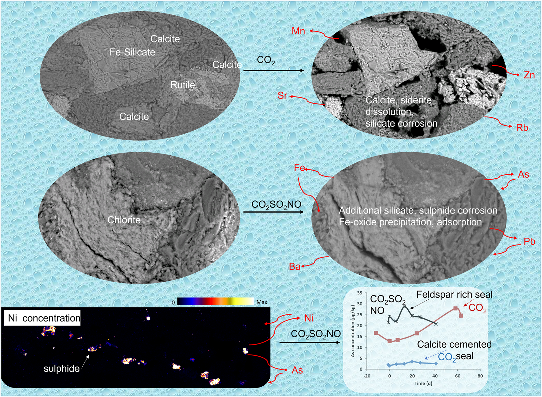 Several studies have observed sandstone bleaching in the Carmel and Entrada caprocks by natural CO2 and minor H2S migration at Green River, Utah, near the Little Grand Wash Fault (Wigley et al., 2013; Kampman et al., 2016; Maskell et al., 2018). Dolomite, hematite, and K-feldspar dissolution was coupled to ankerite/Fe-dolomite, pyrite, hematite, chalcopyrite, and illite precipitation retarding CO2 penetration. Several trace metals (including Fe, Cu, Ni, and Cr) were mobilized by dissolved CO2 reaction; however, they were subsequently re-deposited in precipitates. The mobilization of Fe and Mn from calcite and iron oxyhydroxide was also reported in the saline Frio sandstone during a CO2 field injection demonstration (Kharaka et al., 2006). However, the majority of experimental CO2 reactions have reported major ion changes, but have not reported on minor and trace metals or regulated elements such as arsenic, and were generally only relevant to storage with pure CO2. Experimental studies specifically looking at trace metal behavior have included reactions of limestone or dolomite with CO2 (Wunsch et al., 2013; Wunsch et al., 2014). The main source of metals was determined to be from calcite dissolution, even though higher metal concentrations were locally present in pyrite or clay, with pyrite predicted to be an important source of metals at longer reaction time scales up to 30 years after carbonates reached saturation. CO2-induced calcite dissolution and exchange reactions were also separately related to the mobilization of elements to solution from limestone core (Wang et al., 2016). One study performed drill core reactions with pure CO2 in saline brines to monitor the metal release from a variety of reservoir and seal cores, including from sandstones, shales, carbonates, well cement, and basalt (Karamalidis et al., 2013). Reported increases in dissolved Fe and Mn concentrations from the carbonate cores occurred after CO2 injection, Cr increased and subsequently decreased, and Pb generally increased but remained at low concentrations. The concentration of As, however, increased prior to CO2 addition, indicating an additional desorption or ion exchange source (that can be an artifact of laboratory experiments). Separately, the Southwest Regional Carbon Sequestration Partnerships storage site seal, the Gothic Shale (consisting of clay, calcite, dolomite, quartz, and pyrite), and the carbonate reservoir minerals (dolomite, calcite, and minor pyrite) were reacted with CO2 and brine in hydrothermal experiments to monitor metal release (Marcon and Kaszuba, 2015). The concentration of several metals including Fe, Ba, Pb, Co, Cu, Ni, Zn, and Cd increased initially on CO2 reaction. Subsequently, the precipitation of pyrite, Co-sulfides, siderite, smectite, and oxide minerals decreased the dissolved concentrations of several metals including Pb, Cr, Co, and Zn. The shale caprock was found to be a source of metals but to also favorably provide secondary metal sinks. The above studies have focused on pure CO2 injection under deep saline aquifer storage conditions; however, several low-salinity storage sites are currently being considered for geological storage. In addition if CO2 were to leak to overlying freshwater or drinking water aquifers, water quality changes and metal mobilization could potentially occur (Choi, 2019). The ancillary gases in impure CO2 streams can be a source for further acidification, oxidation, or changes in redox that may affect metal mobilization reactions. Therefore the study of metal mobilization in low-salinity aquifers, with pure or impure CO2, is needed.