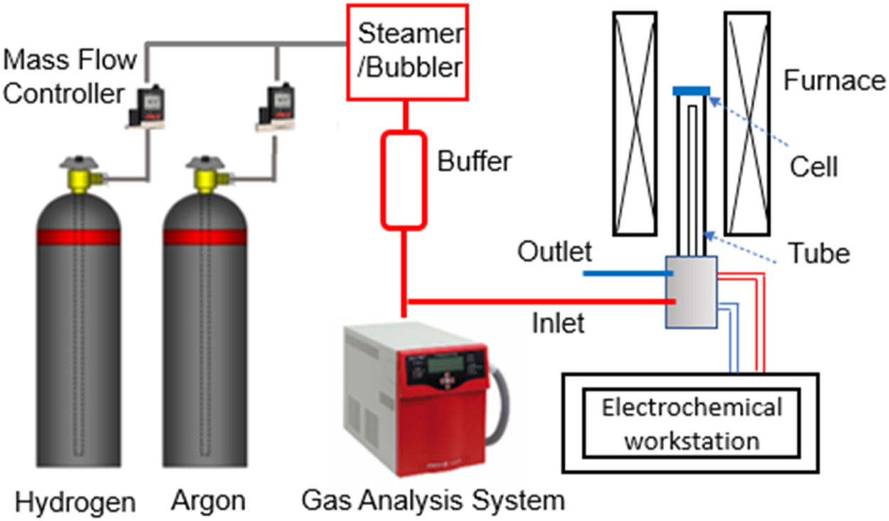 Steam supply is an important component of SOEC systems. A stable and accurate supply of steam can ensure smooth operation of electrolyzers, precise determination of electrolysis performance (e.g., Faradaic efficiency) and identification of the root causes of any cell anomalies. Currently, three types of steam generators have been devised to provide steam for SOECs: 1) bubbler (O’Brien et al., 2007; Zhang et al., 2013; Schefold et al., 2017), 2) steamer (Kim-Lohsoontorn and Bae, 2011; Shen et al., 2022; Zhang et al., 2022), and 3) hydrogen-burner (Hauch et al., 2005). The bubbler is the most popular design, by which a carrier gas is passed through and exits with saturated steam. The bubble design is simple, easy to operate and often used for low-flow-rate steam supply. Therefore, it is widely adopted in laboratory-scale testing, not larger-scale testing. In the steamer design, a precise amount of liquid water per unit time is injected by a syringe pump into a superheated confined space where liquid water is instantaneously vaporized into steam; the latter is then mixed with the carrier gas in the downstream before feeding into the electrolyzer. This design is often used for bench-scale testing, where medium-scale steam flow rates are encountered (Yamada et al., 2006; Fujiwara et al., 2008). Hydrogen-burner design operates on the principle that excess hydrogen is burned in a pure oxygen environment to produce the desirable hydrogen/steam mixture for electrolysis (Hochmuth, 1978; Hauch et al., 2005; Alabbadi, 2012). By controlling the ratio of hydrogen/oxygen, different ratios of hydrogen/steam can be created. This design produces stable steam supply in precision flow rates, but requires special design of reactor (or microreactor) and additional safety considerations. Therefore, it is only suited for large-scale SOECs requiring high steam flow rates and high safety standard.