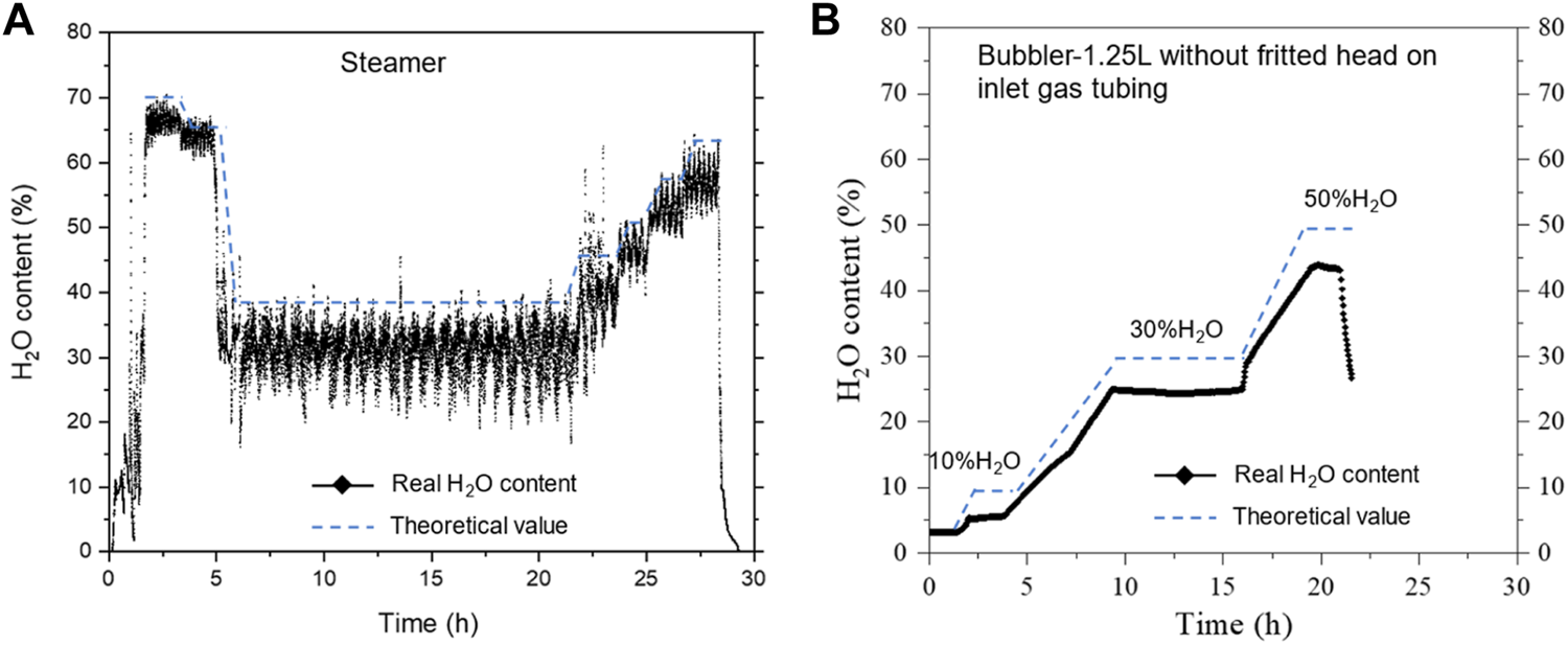 Comparison of steam contents from the homemade (A) steamer and (B) bubbler. Carrier gas flow rate: 60 sccm Ar.