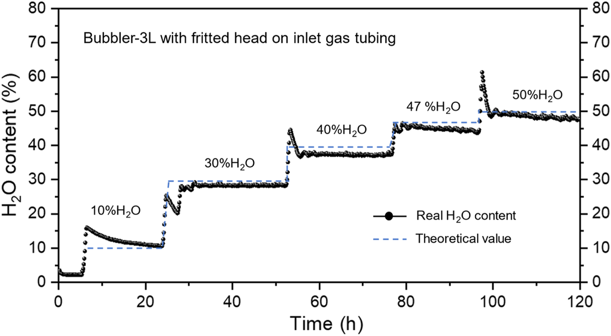 Based on the above observation, we then changed the bubbler by increasing the total volume of the bubble from 1.25 to 3.0 L and added a fritted head to the inlet gas tubing. The testing results are shown in Figure 4. It is clear that the steam content is stable at all levels during the test; no sign of oscillations is seen. Moreover, the difference of H2O content between the set and measured values is within 0∼2%, demonstrating the improvement by the change of bubbler volume and inlet tubing. On the other hand, it is found that the steam content tends to drift with time, particularly at higher steam contents. This can be attributed to the partial steam condensation somewhere such as dead corners inside the bubbler as well as gradually lowered water level inside the bubbler. Thus, a larger volume is always preferrable for the bubbler to operate longer time without interruption such as water refill. In addition, the steam content variations at each temperature transition are likely caused by the bubbler temperature variations, which can be mitigated by re-tuning the temperature controller.