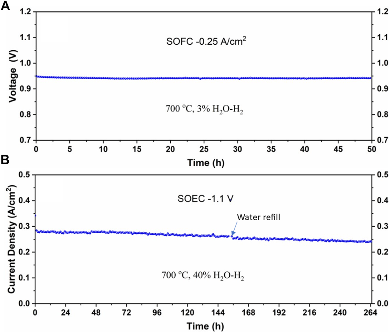 The stability of the cell under (A) low-steam SOFC and (B) high-steam SOEC modes at 700°C.