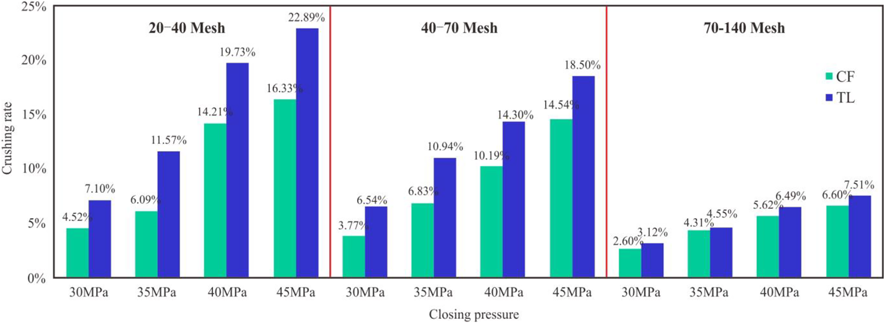 Figure 1 shows the comparison of the crushing rate of six proppants with the closure pressure. As it can be seen that with the closure pressure reaching 35 MPa, the crushing rate of all proppants have increased significantly, however, as the increase of mesh size of proppants, the magnitude of this increase gradually decreases. The crushing rate of the two types of quartz proppants decreases with the increase of the mesh number. At the same time, the proppant crushing rate of CF is lower than that of TL, and its crushing rate is about 20%–40% lower. Therefore, it can be concluded that the proppant produced in CF has better anti-crushing rate than the proppant produced in TL.