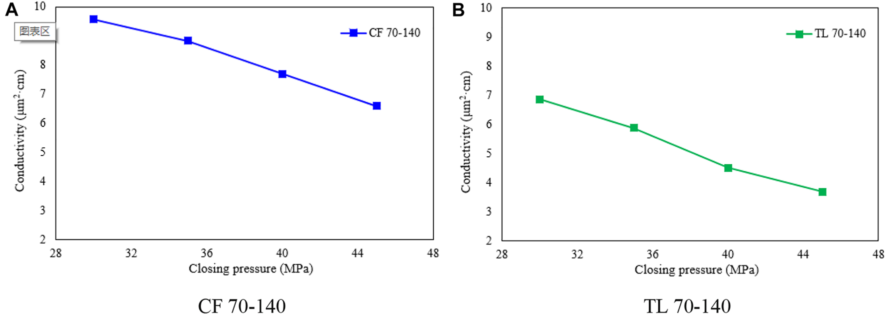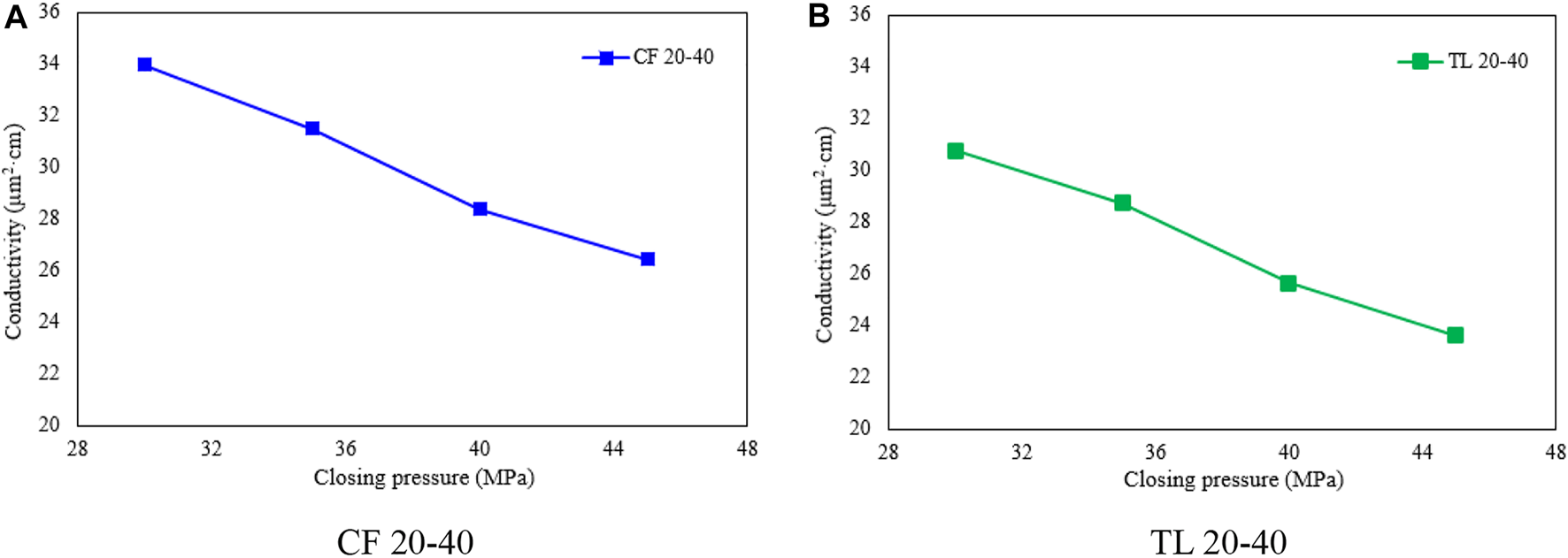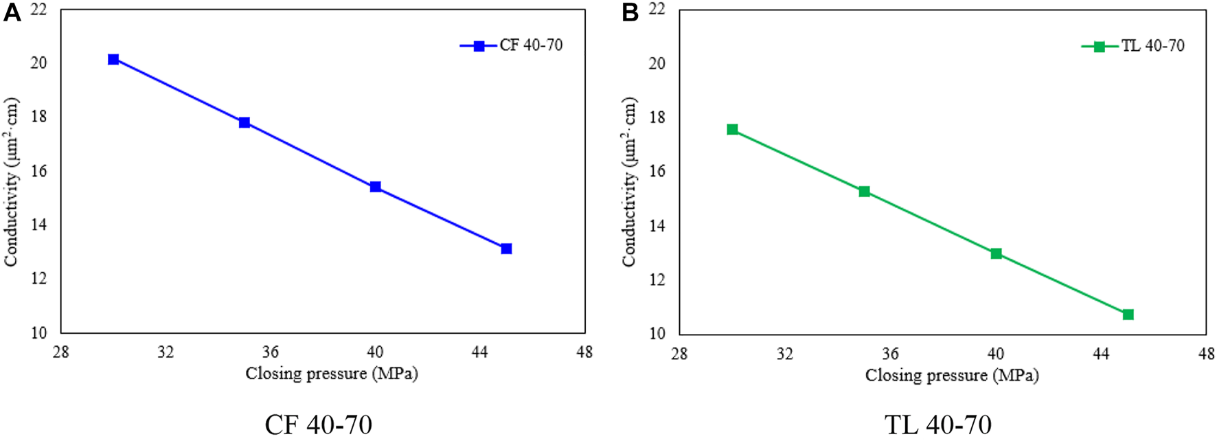 Secondly, Figure 7 shows the conductivity of 40–70 mesh proppant varies with the closing pressure, it can be seen that when the closing pressure is 30, 35, 40MPa, 45 MPa respectively, the conductivity of the proppant in CF is higher than that of the proppant produced in TL by 12.89%, 14.25%, 15.57%, 19.56%. Therefore, when the mesh number of proppant is 40–70, the proppant produced in CF own greater conductivity property.