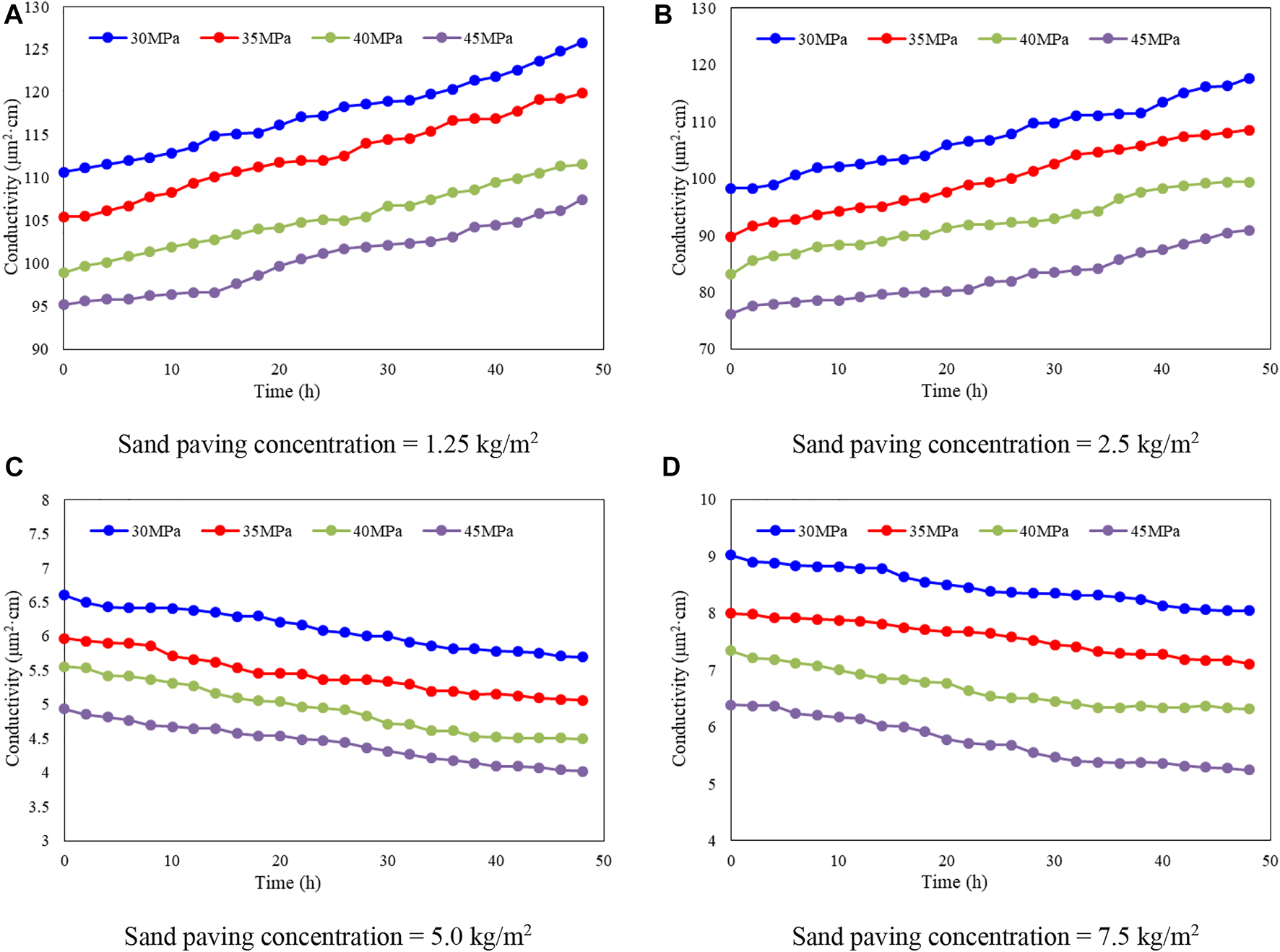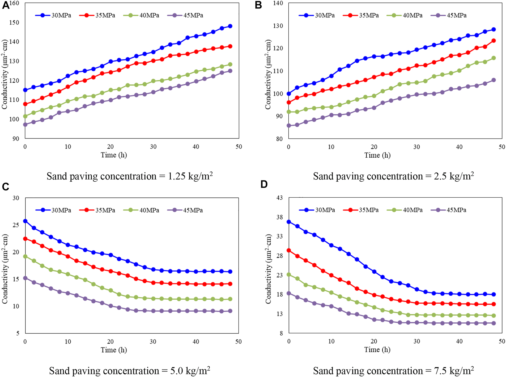 4.1 Proppant conductivity tests of CF 20–40 at different sand paving concentrations