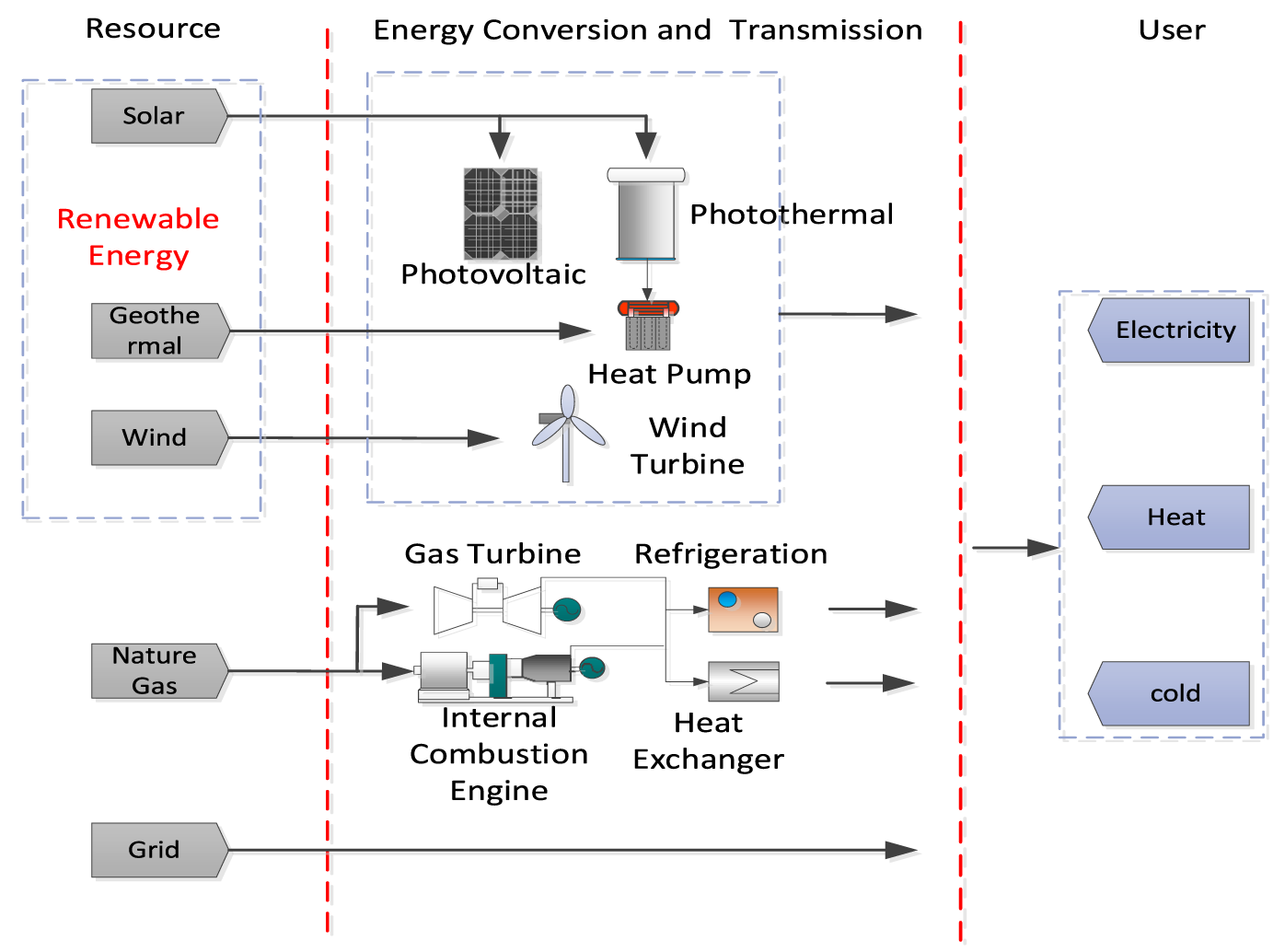 It can be seen from the above research that the series integration of solar and natural gas distributed energy systems is very diverse. Solar energy can penetrate from the fuel end of the natural gas distributed energy system to the waste heat recovery end. In contrast, the series integration of wind energy, geothermal energy, etc. with the natural gas distributed energy system is much less, and its integration is mainly at the waste heat recovery end. Parallel integration is a relatively common way to realize the complementary utilization of these energies.