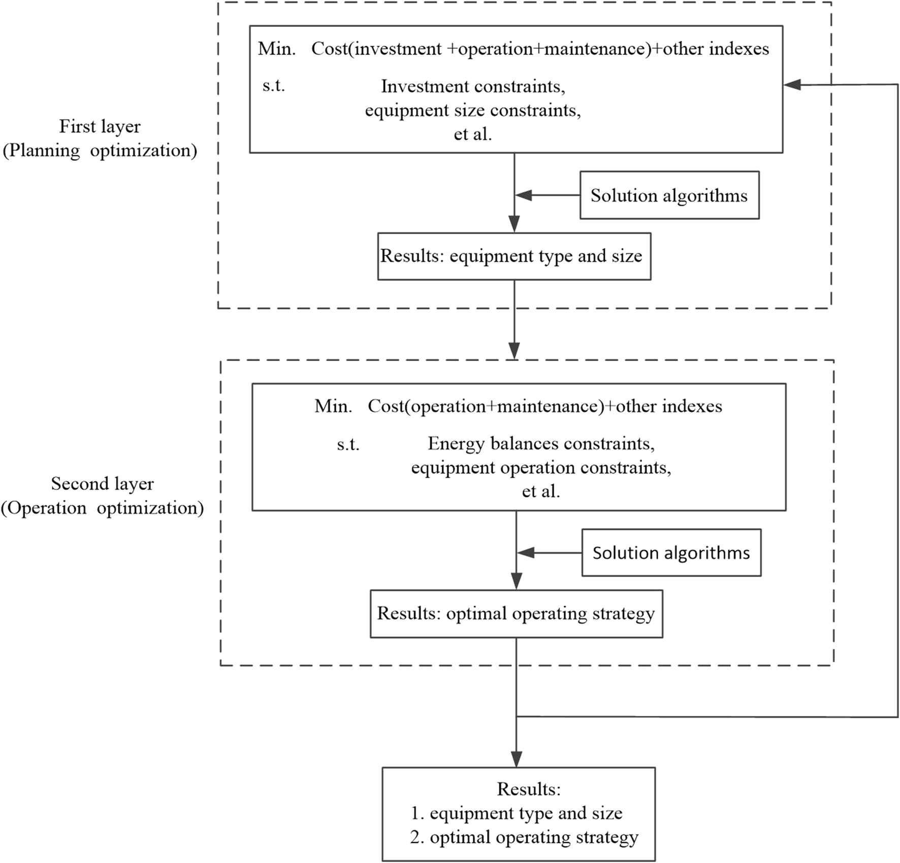 Based on the centralized architecture, many studies have been carried out on hybrid energy systems. Yi et al. (2022) proposed a mixed integer nonlinear programming (MINLP) model and solved it using GAMS/DICOPT to obtain the optimal configuration of a solar-assisted natural gas distributed energy system with energy storage. Jianli et al. (2021) established a mixed integer programming model for a gas-wind-light-hydrogen integrated energy system with the goal of minimizing the total annual cost and carbon emissions, etc. The advantage of the centralized architecture is that he construction of the model can be closer to the original appearance of the problem, and there is no need to worry about the loss of information that may be caused by the separation of the planning optimization model and the operation optimization model in the layered architecture. Therefore, with the support of efficient solving algorithms, the Centralized architecture is more likely to obtain theoretical optimal values than the layered architecture. However, as the complexity of the problem increases, the shortcomings of the overall architecture will become more and more obvious. The model obtained based on this method may be difficult to solve, and the accuracy of the model description and the solution efficiency are not easy to balance, which eventually leads to the problem of the quality of the optimization results.