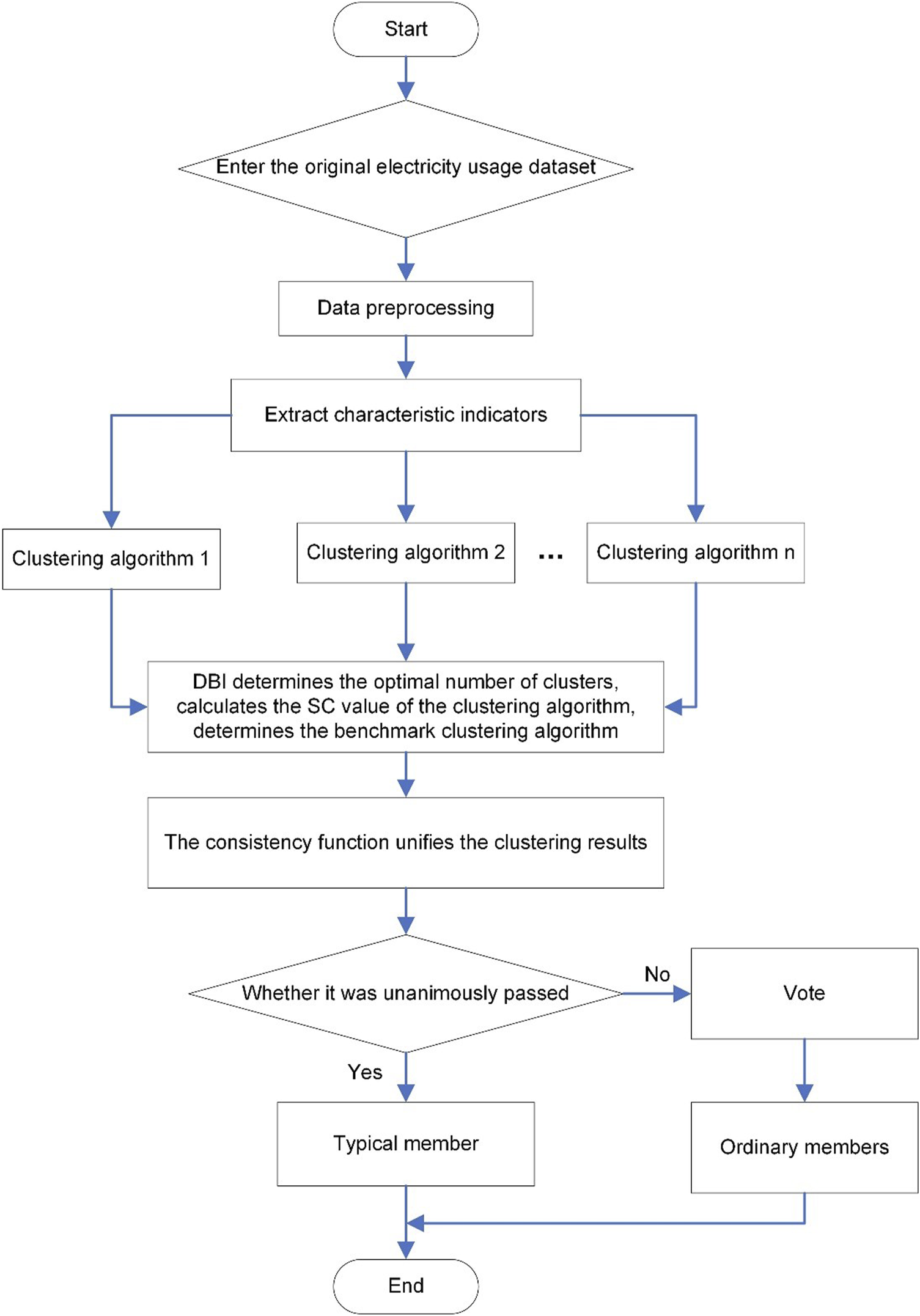 The one-layer clustering process of residential electricity load characteristics based on the voting method (Yan et al., 2021) is shown in Figure 1. First, the user’s original dataset is collected for data preprocessing, and then, feature engineering is used to extract load curve features. Each member algorithm is used to cluster the dataset, the number of clusters is determined through improved DBI, and then, the SC index is used to determine benchmark clustering. Finally, the clustering results of each member algorithm are unified through the consistency function, and the voting method is used to divide the curves of ordinary and typical members. Figure 1 shows the one-layer clustering process.