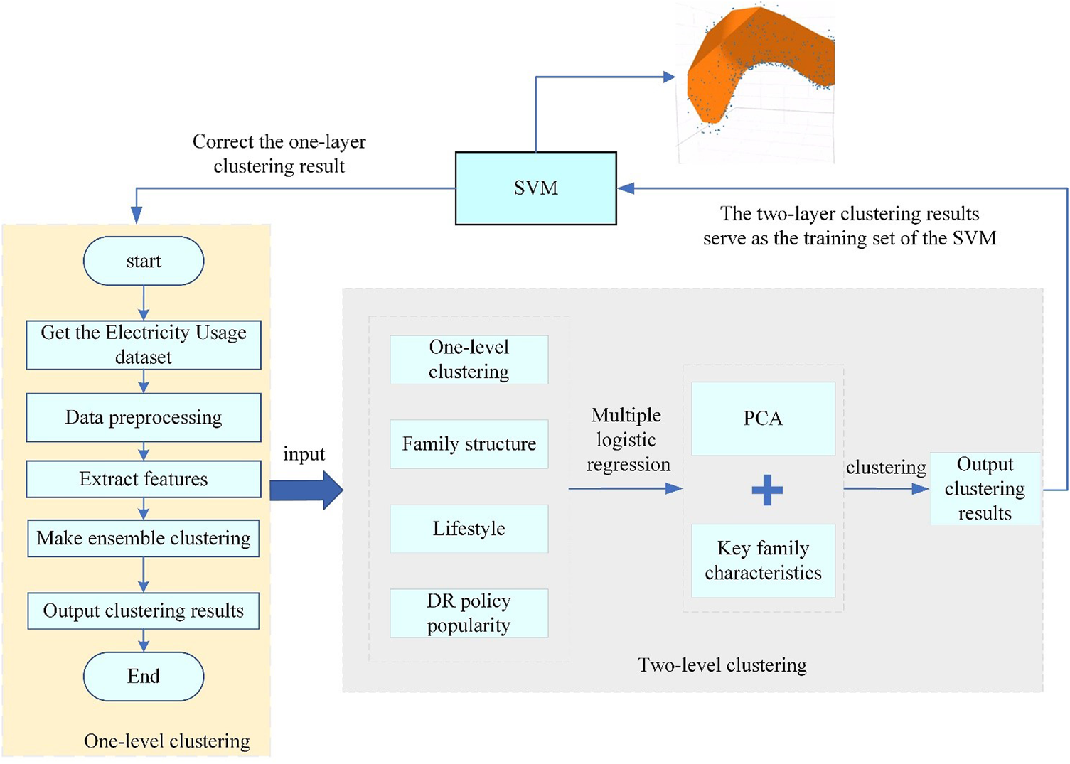 In the above literature, when considering the clustering of users' energy consumption characteristics, most of them are based on the user’s electricity consumption data for load analysis (Sun et al., 2021; Li et al., 2023). In response to the above phenomenon, this article proposes a two-level clustering and correction method that comprehensively considers user electricity characteristics and key features. It uses the advantages of integrated clustering and fusion of multiple member algorithms to perform a layer of clustering on user electricity data. Based on the results of the layer of clustering, combined with the user’s key family information, multi-dimensional information clustering of users is achieved. Finally, the nonlinear mapping ability of SVM is used to reverse-correct the clustering layer results and achieve precise differentiation of energy consumption characteristics and regulatory potential among different users.