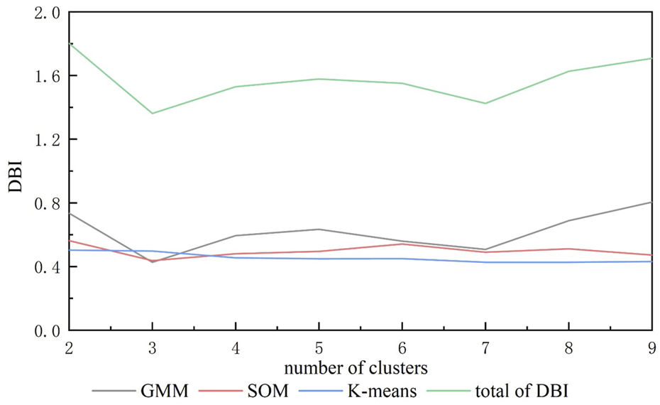 The effectiveness metric of clustering is often used to measure the effectiveness of clustering results and select the appropriate number of clusters. Good clustering results should have a high within-class similarity and low between-class similarity. Therefore, the improved Davies–Bouldin index (DBI) was selected to evaluate the clustering effect and determine the optimal number of clusters (Wang et al., 2022):