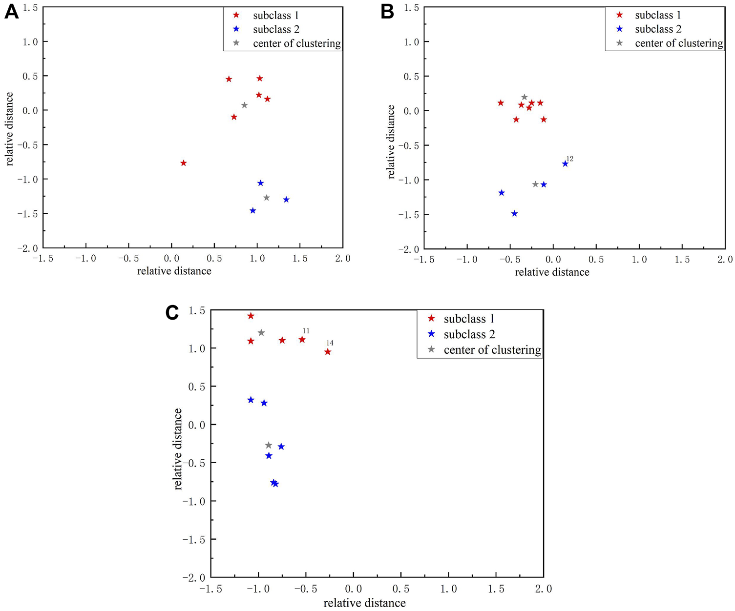 Figure 4A represents the first type of users, Figure 4B represents the second type of users, and Figure 4C represents the third type of users. The gray color represents the cluster center, and the red and blue colors represent the sample.
