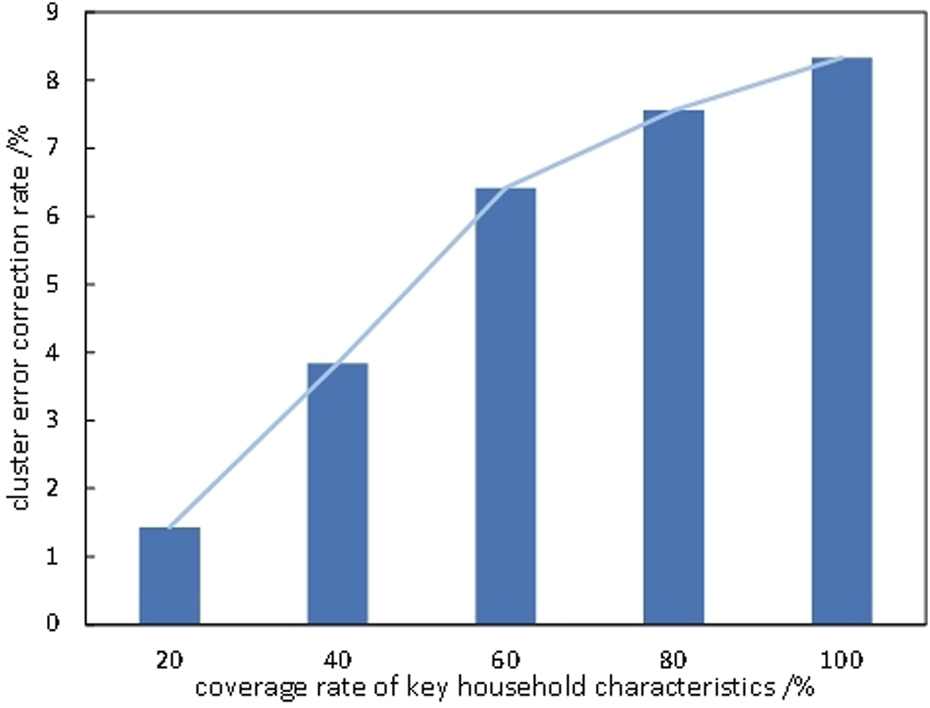 As can be seen from Figure 6, the key family characteristic factors are proportional to the clustering error correction rate. When the coverage rate of key household factors is 20%–60%, the correction rate of clustering error is low, and the increase is larger. However, when the coverage rate exceeds 60%, the increase in the clustering error correction rate becomes less pronounced, yielding a more ideal effect.