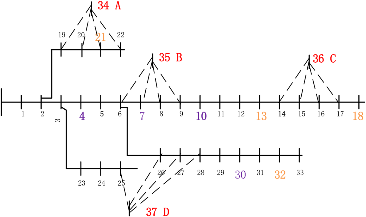 In Eq. 14: represents the collection of distributed generation types to be selected, this paper incorporates both wind power and photovoltaic power generation; is the set of class k distributed generation installation nodes to be selected; is a variable of 0–1, which indicates whether node p is equipped with class k distributed generation; represents the unit capacity investment cost for k-type distributed generation; is the installed capacity of class k distributed generation at node p.
