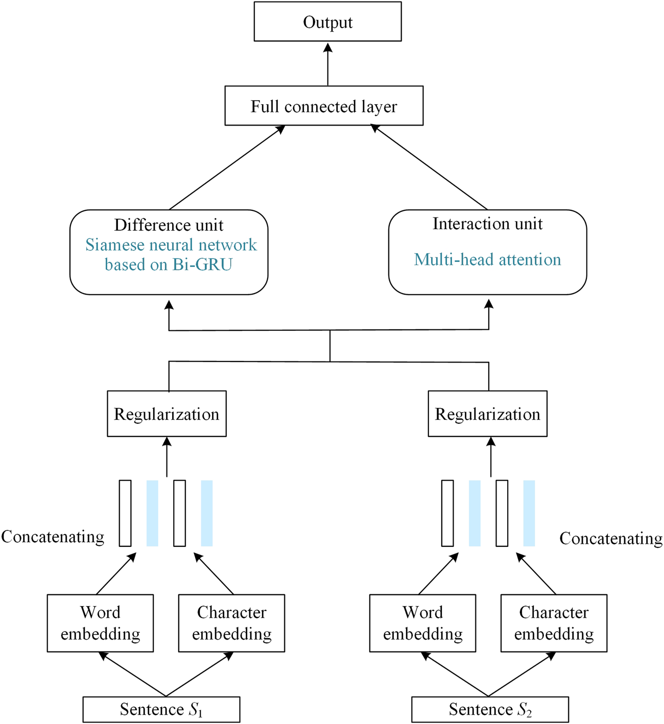 This model initially preprocesses two sentences at the input layer, obtaining mixed vectors for both sentences. The resulting mixed vectors undergo normalization through a regularization layer. Subsequently, these processed vectors are separately fed into the difference unit and interaction unit.