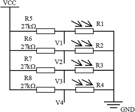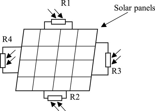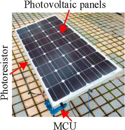 The solar tracking system’s core components include a Micro Controller Unit (MCU) and an array of photovoltaic sensors. The selected MCU model is SCT15W4K58S4. Its control circuit design are shown in Figure 1. Photovoltaic resistors R1, R2, R3, and R4 are fixed at the four corners of the solar panel. They are connected to the Analog Digital Converter (ADC) input ports of the MCU, corresponding to V1, V2, V3, and V4 in Figure 2. By collecting and analyzing these four voltage signals, the system can accurately calculate the sun’s position and adjust the solar panel’s angle accordingly. The actual installation diagram of the equipment is shown in Figure 3.