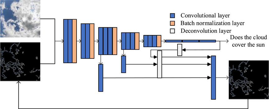 The VGG cloud prediction network takes the previous moment’s cloud edge image and the current cloud image as input. It outputs the current cloud edge image and predicts whether the sun will be obscured at the next moment. Its architecture is divided into nine main parts (Thakur et al., 2024). The first five parts consist of alternating 3 × 3 convolution layers and pooling layers, capturing local features. The use of smaller convolution kernels allows the network to increase depth without parameter inflation, enhancing expressiveness. Pooling layers reduce feature map resolution, preserving crucial information while decreasing computational complexity. The subsequent fully connected layers integrate local features into global features for image classification and prediction. The final deconvolution layers upsample feature maps, enabling precise cloud edge localization.