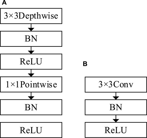Figure 6. Comparison of DSC and normal convolution; (A) Depthwise Separable Convolution; (B) Normal Convolution.