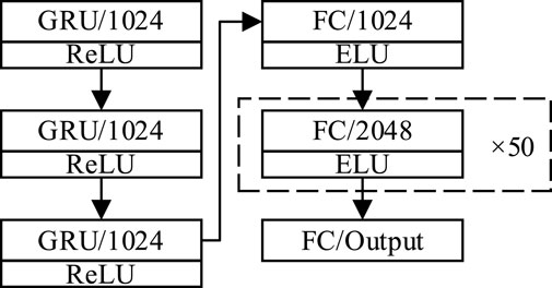 The network begins with a three-layer stack of GRU units, which constructs a time series prediction network. This structure enables the network to model temporal dependencies in the input data. Following the GRU layers, the network transitions to a deep neural network consisting of 52 fully connected layers. These layers learn and produce the predicted photovoltaic power output. The fully connected layers comprise one layer with 1024 neurons, 50 layers with 2048 neurons each, and one output layer with a number of neurons equal to the desired output.