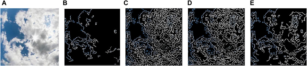 Figure 12. Cloud edge extraction results; (A) Original cloud map; (B) DSCVGG; (C) Roberts; (D) Prewitt (E) Sobel.