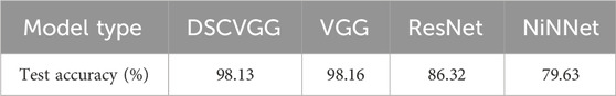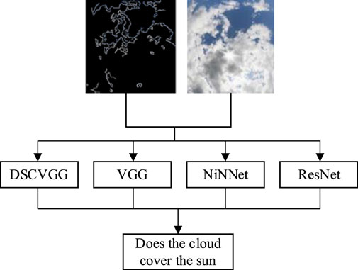 Furthermore, to validate the accuracy of predictions regarding whether the clouds will obscure the sun at the next moment, we used the edge-extracted image from Figure 12B and the current cloud layer image as input, with the output being whether the clouds will obscure the sun at the next moment. As shown in Figure 13, during the experimentation, the DSCVGG model and the VGG model were trained and tested, and their performance was compared with other similar network models, such as NiNNet and ResNet. Figure 14 displays the accuracy of different models on the test set, while Table 1 provides a detailed breakdown of the accuracy of these four models in predicting whether the clouds will obscure the sun at the next moment. Table 2 records the average computation time required for these models to perform 1000 predictions.