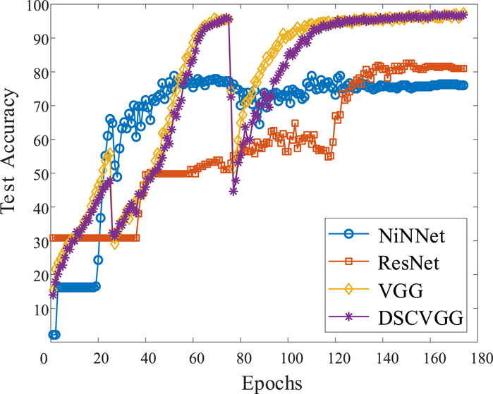 As indicated in Figure 14, the cloud motion prediction model based on DSCVGG converged after approximately 150 training iterations. When comparing the test accuracy as shown in Table 1, the DSCVGG model outperforms the NiNNet model and is slightly better than the deeper ResNet model, with its accuracy being comparable to that of the VGG model. Therefore, from an accuracy perspective, the DSCVGG model is exceptionally good.