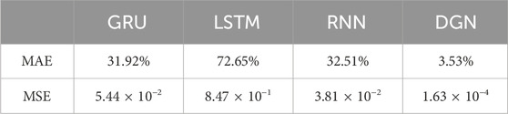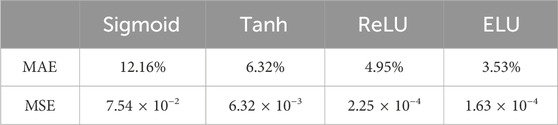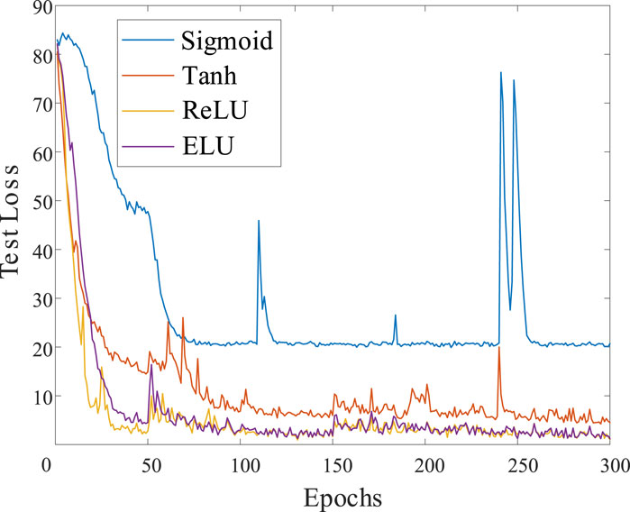 From the results shown in Figure 15 and Table 3, it can be observed that the DGN network based on the ELU activation function starts to converge around the 150th epoch, and its test loss, MAE, and MSE are lower than those of models using the other three activation functions. Therefore, for subsequent experiments, the DGN model based on the ELU activation function will be selected as the performance testing model.