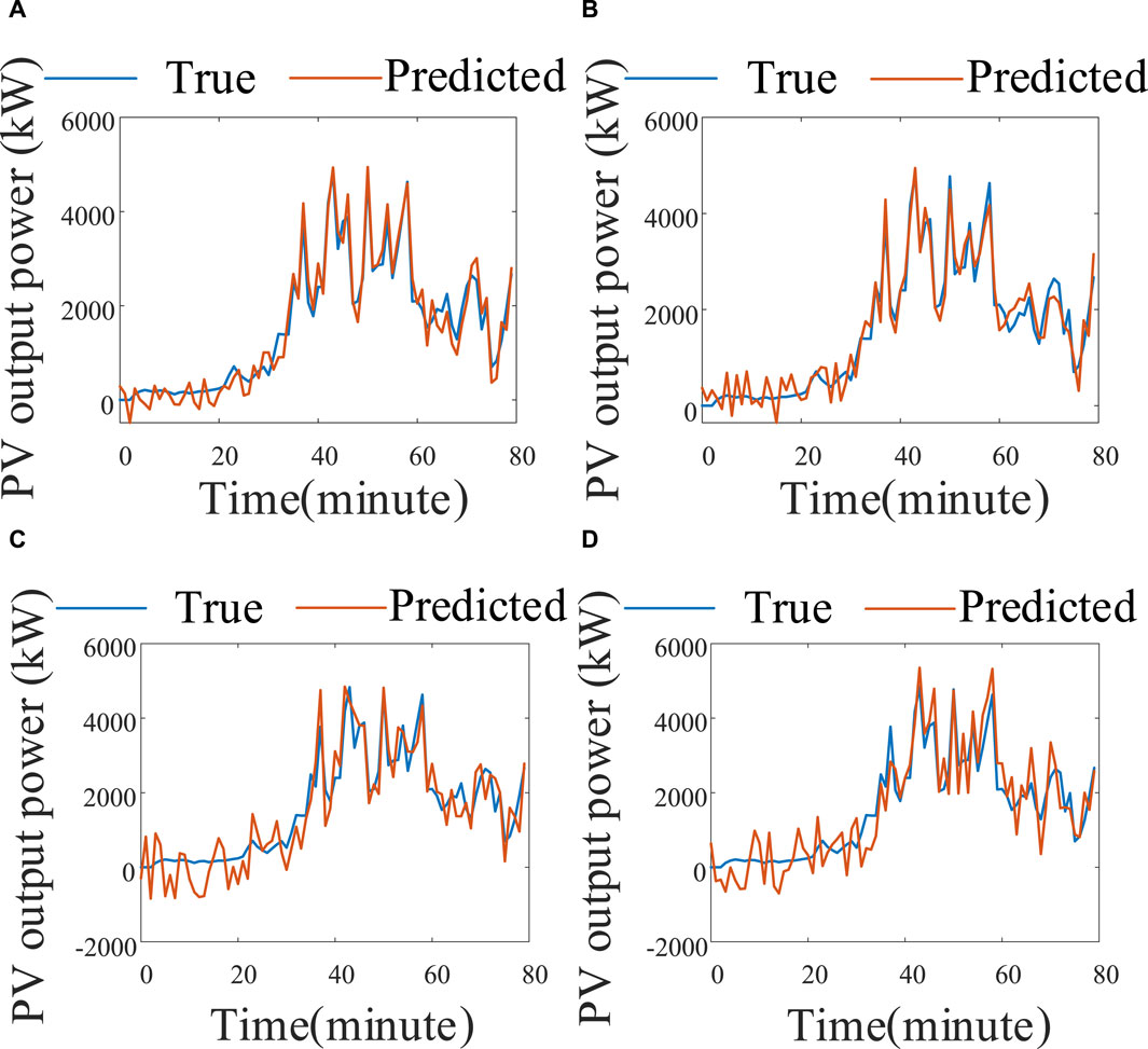 Figure 17. The DSCVGG-DGN model and the PV output prediction diagram of the other three models; (A) DSCVGG-DGN; (B) DGN; (C) RNN; (D) GRU.