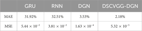 To mitigate the short-term fluctuations in photovoltaic output caused by cloud movement and solar obscuration, this study integrates the cloud movement data predicted by the DSCVGG model with the input data of the DGN model described in Section 4.3, feeding them together into the DGN model. The aim is to enhance the accuracy of photovoltaic output predictions by incorporating information on cloud movement predictions. According to the research in literature (Ming et al., 2015), the influence coefficient of clouds on irradiance ranges from 0.4 to 0.9. In this experiment, we take the average influence coefficient of 0.65. This means that when the prediction indicates that clouds will obscure the sun, we consider that the photovoltaic output prediction data for the next moment needs to be multiplied by this influence coefficient to adjust the predicted value.