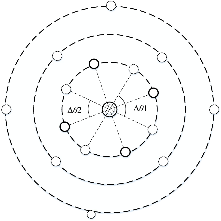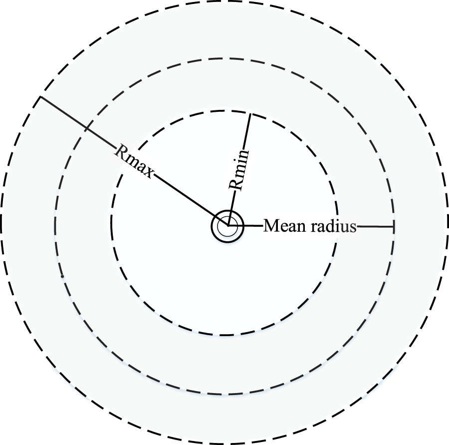 Center Circle Set Ω: The set of all center circles, where each center circle is a ring centered on the substation. The positions of all center circles are constrained within an annular-shaped region. The width of the annular-shaped region is set as the difference between the maximum supply radius Rmax and the minimum supply radius Rmin. And Rmax and Rmin represent the farthest and nearest Euclidean distances from the loads to the substation, respectively. A polar coordinate system is established with the substation location as the origin. The radius of the center circle ring in the annular-shaped region is the average polar radius of all loads and DGs within the service area of substation. The schematic diagram is shown as Figure 1.
