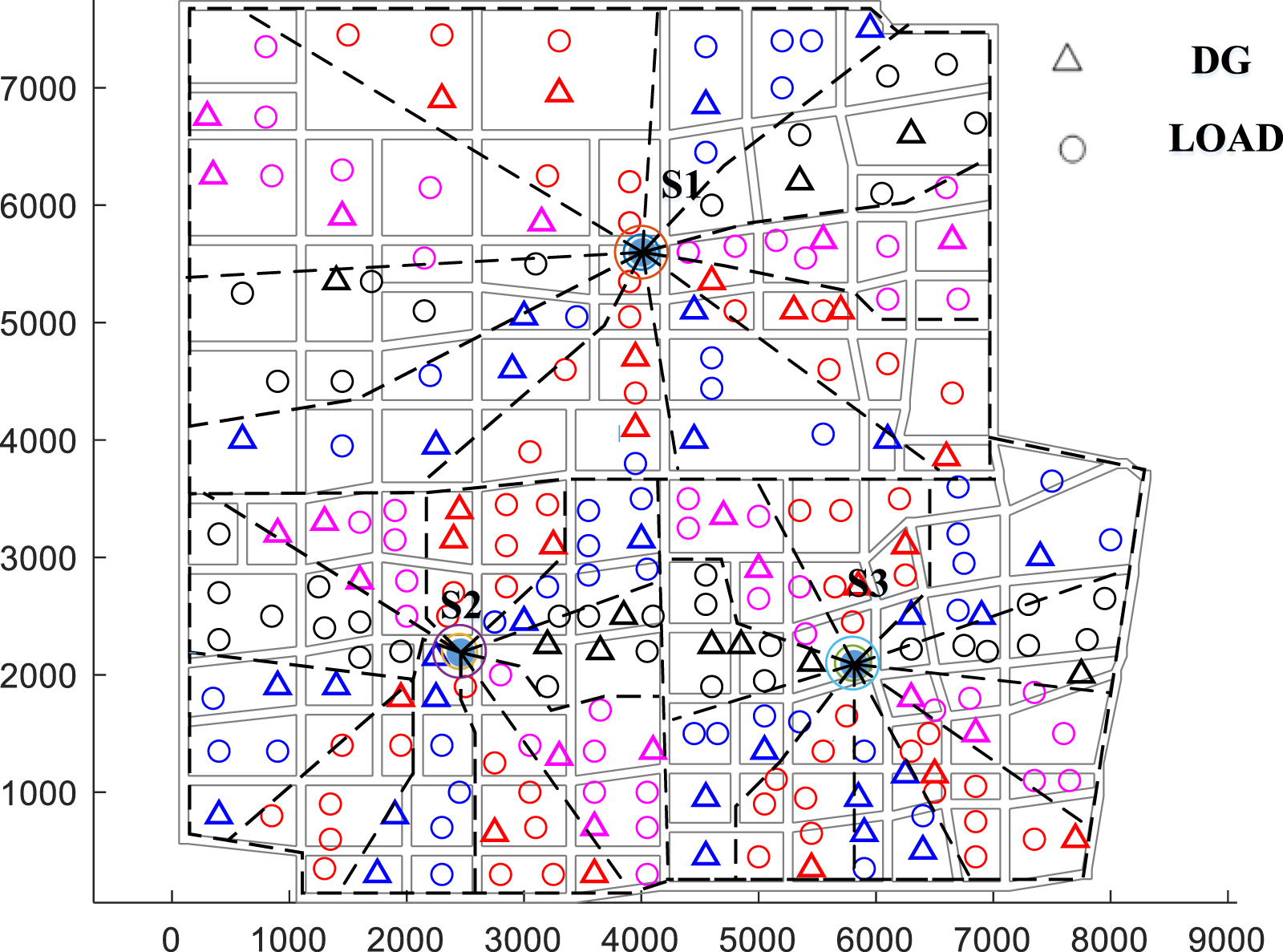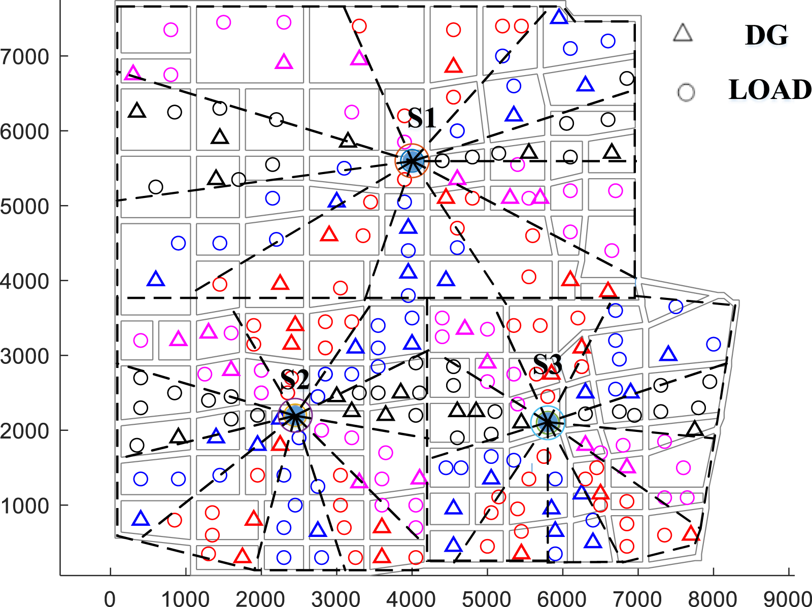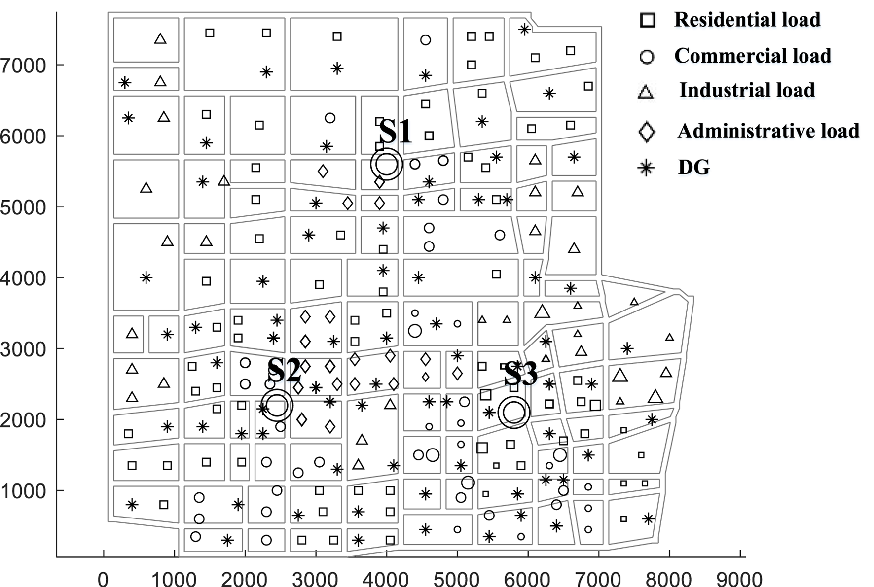 The case study consists of a power grid formed by three 2 × 63MVA substations, with single busbar connection mode. The maximum load factor for feeder blocks is set to 50%. There is a total of 160, 156, and 150 loads and DGs in the three substations, respectively. The loads include residential, commercial, industrial, and administrative types, while the DGs are photovoltaics. The geographical distribution of the sources and loads is shown in the Figure 5, where the asterisks represent DGs, and the other symbols represent various types of loads.