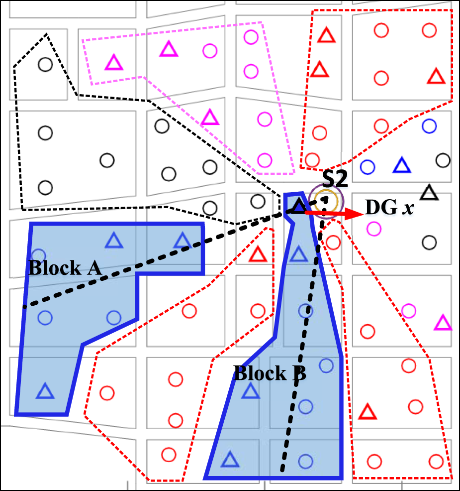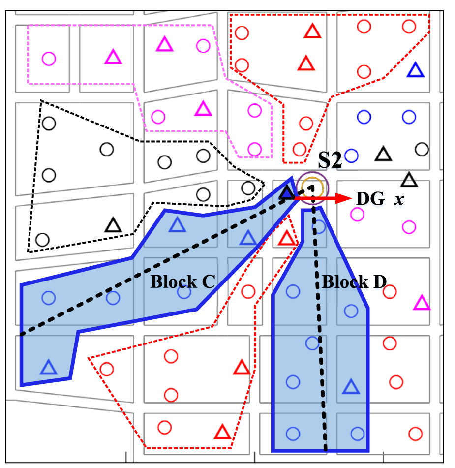 As shown in Figure 8, it is evident that the algorithm proposed in reference (Shaoyun et al., 2020) divisions the blocks based on N centerline rays emanating from the substations. The clustering is obtained by computing the weighted distances from the loads to each centerline. Since the centerlines originate from the substations and the x labeled DG is adjacent to S2, it falls within the dense region of centerline rays, with its trajectory almost overlapping with the centerline of block C. In this scenario, when calculating the weighted distance of this DG, the effect of the weighting factor is severely diminished due to the close proximity to the centerlines. Consequently, the DG is unreasonably assigned to block C, which does not contribute to improving the overall performance of the feeder blocks.