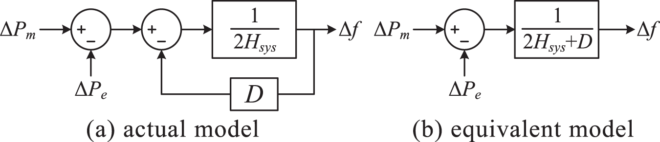 The rotor motion equation of a synchronous generator describes the variation in rotor speed under unbalanced torque when fluctuations occur in the mechanical power output by the prime mover or the electromagnetic power output by the synchronous machine. It can be expressed as:where ΔPm is the mechanical power output of the prime mover; ΔPe is the electromagnetic power output of the synchronous machine; Δf is the frequency variation (since the frequency f is directly proportional to the rotor angular velocity ω, for a more intuitive representation of the power-frequency relationship, the frequency deviation Δf will be used as a substitute for the angular velocity variation Δω; Hsys represents the equivalent inertia time constant of the generator set:where n represents the number of synchronous units in the system, Si and Hi are their respective rated capacities and inertia time constants, while SB(SG) denotes the total rated capacity of conventional SG. The system load’s response to frequency deviations is primarily encapsulated in the load damping constant D. When a frequency deviation occurs, the variation in load power is given by:where ΔPL represents the power variation of frequency-sensitive loads, and D is the load damping constant. Applying Laplace transforms to Equations 1 and 3 yields the equivalent model of the generator and load, as illustrated in Figure 1A. Figure 1B depicts the simplified version of this model.