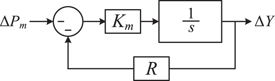 In the figure, R represents the equivalent droop coefficient of the generator set, which physically signifies the ratio between the frequency variation and the change in generator output power. By simplifying Figure 3 and combining it with Figure 2, we obtain the equivalent model of the prime mover and governor as shown in Figure 4, where Ts = 1/(KmR) represents the inertia time constant of the governor.