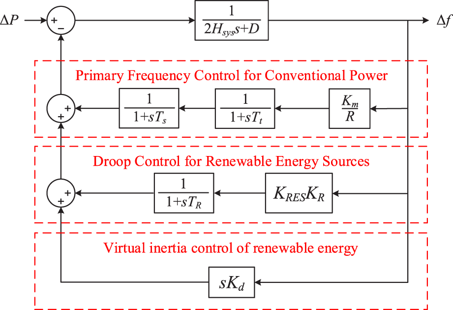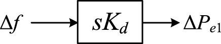 The VSM technology enables renewable energy interfaces, such as converters, to mimic the virtual inertia characteristics of synchronous machines by appending control loops. The basic working principle involves adjusting the output power of renewable energy units in response to frequency deviations during system disturbances, thereby equipping them with the capability to respond to frequency variations. Analogous to the rotational inertia effect of synchronous machines, the variation in output power of renewables through virtual inertia control in response to frequency changes is given by:where ΔPe1 is variation in output power of renewable energy units under virtual inertia control, where kd represents the virtual inertia coefficient. Applying the Laplace transform to Equation 4 yields the SFR of renewables equipped with virtual inertia characteristics, as depicted in Figure 5.